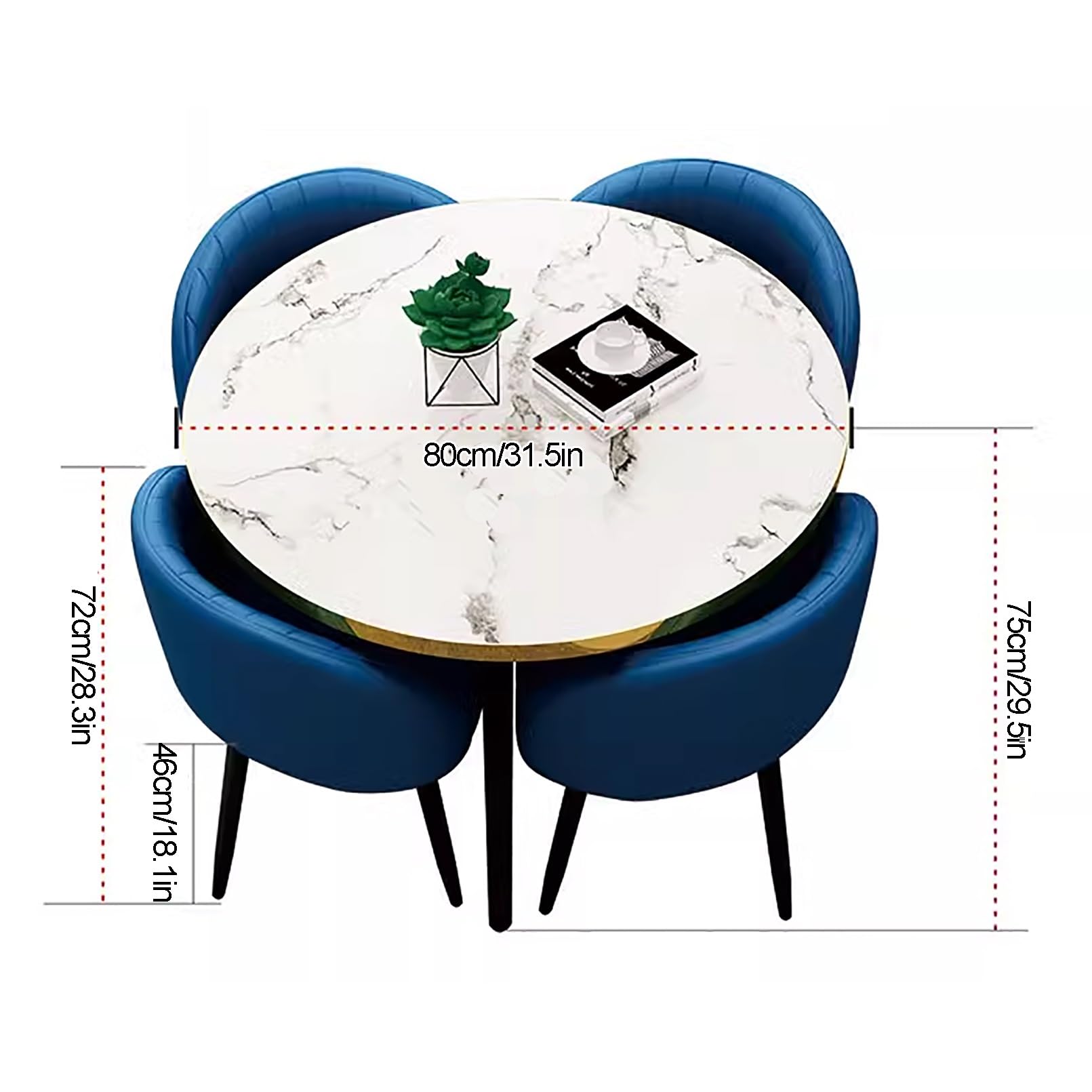 Perfektes Esszimmer-Set für 4 Personen! Dieser runde Tisch mit 80cm Durchmesser und 35cm Höhe passt auch in kleinere Räume. In schwarz mit modernem Design - zeitlos schön! Inklusive 4 bequemen Stühlen mit ergonomischer Rückenlehne. Die Tischplatte in Marmoroptik ist kratzfest und pflegeleicht. Stuhlbezüge aus hochwertigem PU-Leder oder Baumwollleinen - bequem und atmungsaktiv. Stabile Eisenkonstruktion mit rutschfesten Füßen. Perfekt für Küche, Wohnzimmer, Büro oder Café. Platzsparend und vielseitig einsetzbar. Einfach aufbauen und sofort nutzen! Hol dir jetzt dieses komplette Set für gemütliche Familienessen oder gesellige Abende mit Freunden!
