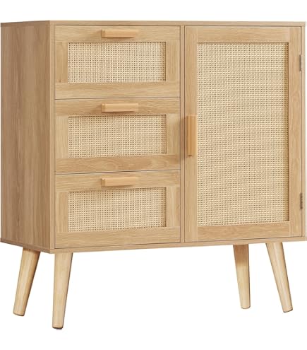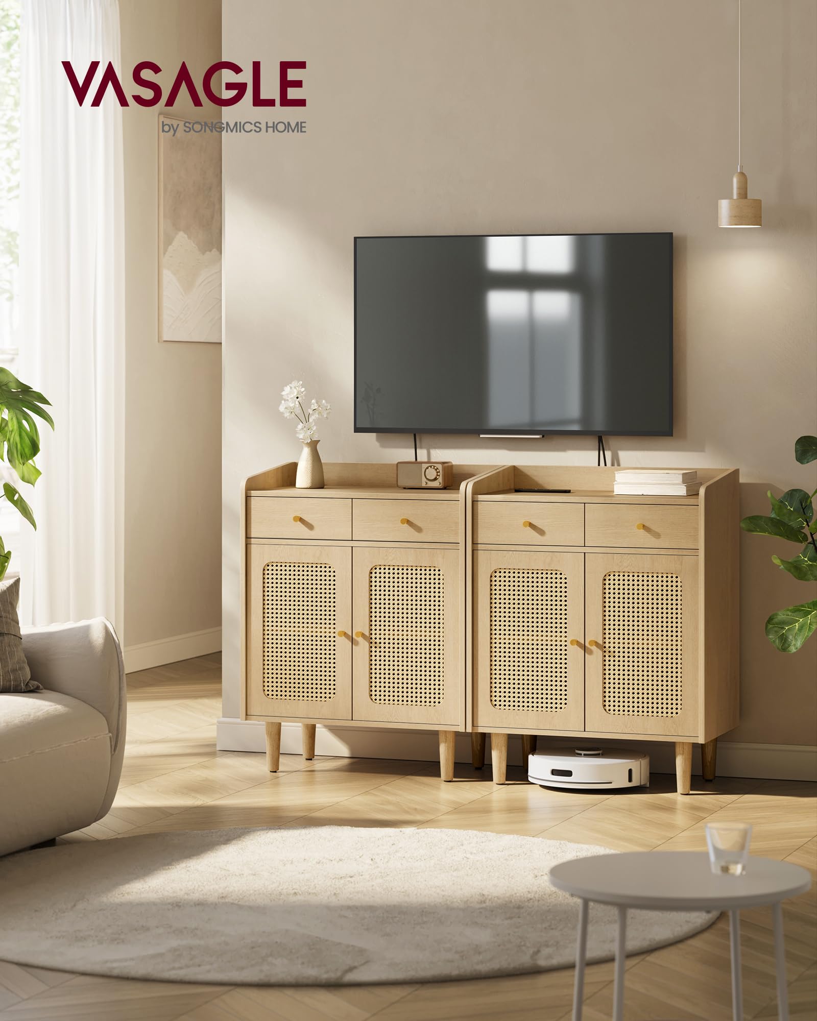 Boho-Charme für dein Zuhause! Dieses VASAGLE Sideboard in Eichenbeige mit Rattan-Optik bringt natürlichen Style in deine Einrichtung. Mit 70x90cm Größe bietet es reichlich Stauraum: 2 Schubladen, verstellbare Ablage und geräumige Deckplatte. Die Massivholzbeine und abgerundeten Ecken sorgen für Stabilität und Sicherheit. Perfekt als Küchenschrank, Kaffeebar oder Flurmöbel. Einfache Montage inklusive Kippschutz - für mehr Sicherheit in Haushalten mit Kindern.
