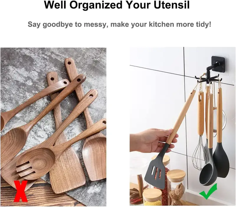 Boah, dieser Küchenorganizer ist mega praktisch! Er dreht sich komplett um 360 Grad, sodass du alle deine Kochutensilien immer griffbereit hast. Aus robustem Stahl gebaut, hält er ewig und rostet nicht. Mit 8 Haken findest du Platz für Schöpfkellen, Löffel, Spaghetti-Server und mehr. Der verdickte Boden verhindert lästiges Kippen - super sicher auch bei hektischem Kochen. Einfach auf die Arbeitsplatte stellen oder aufhängen, ganz ohne Bohren. Deine Küche sieht sofort aufgeräumter aus und du sparst Zeit beim Suchen. Perfekt für alle, die eine ordentliche Küche lieben!