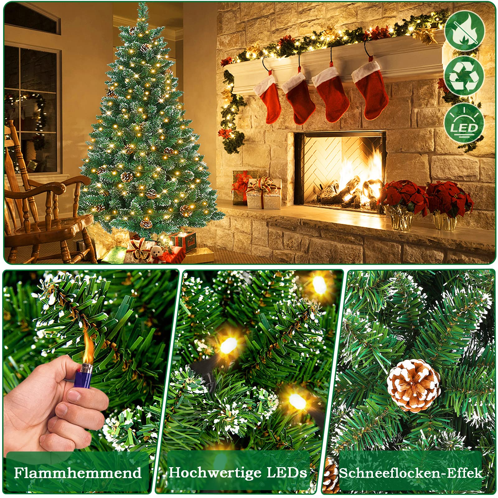 LILIIN 180cm Weihnachtsbaum Künstlich - Mit Beleuchtung, Schnee-Effekt & Kiefernzapfen