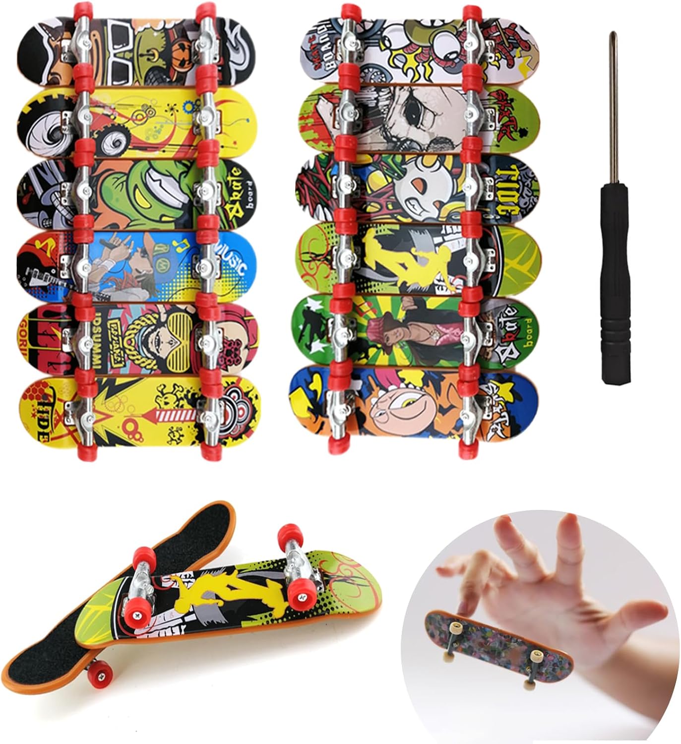 Total cool: Dieses Set mit 20 Mini-Finger-Skateboards bringt Spaß für Groß und Klein! Jedes Board ist nur 9,5 cm lang und in bunten, cartoonigen Designs gestaltet - da ist für jeden Geschmack was dabei. Aus hochwertigem PP-Material sind sie robust, bruchfest und halten so einiges aus. Die Kinder trainieren spielerisch ihre Fingerfertigkeit und verbessern dabei motorische Fähigkeiten und Konzentration. Perfekt als Geburtstagsgeschenk, für Kinderpartys oder als kleine Aufmerksamkeit. Auch als Füllung für Party-Tüten oder als Belohnung in der Schule super geeignet. Kompakt und leicht, passen sie in jede Tasche - so kann der Spaß überall mit hin. Ob zu Hause, in der Schule oder unterwegs - mit diesen Fingerboards sind die Kids stundenlang beschäftigt. Ein kreatives Spielzeug, das nicht nur unterhält, sondern auch die Entwicklung fördert. Einfach auspacken und losrollen!