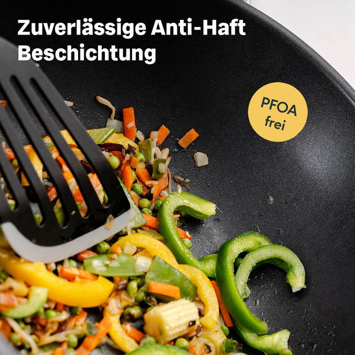 Perfekt für asiatische Gerichte und scharfes Anbraten! Dieser KESOTO Wok hat alles, was du für authentisches Wok-Kochen brauchst. Mit 40cm Durchmesser ist er groß genug für die ganze Familie. Aus robustem Eisenmaterial, das sich super schnell erhitzt und die Wärme super gleichmäßig verteilt. Der dicke Boden und die dünnen Wände sind genau richtig für perfektes Bratgemüse. Und das Beste: Er funktioniert auf ALLEN Herdarten - Induktion, Gas oder Elektro! Inklusive passendem Deckel, sodass du auch dampfgaren kannst. Einfach vor dem ersten Gebrauch reinigen und einölen - dann kann's losgehen mit Stir-Fry, Currys oder was dir sonst so einfällt. Ob für Profi-Köche oder Hobby-Koch - mit diesem Wok wird jedes Gericht ein Hit!