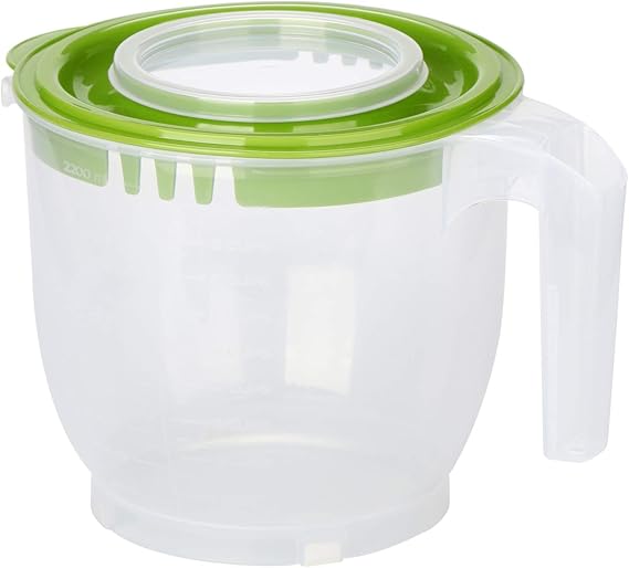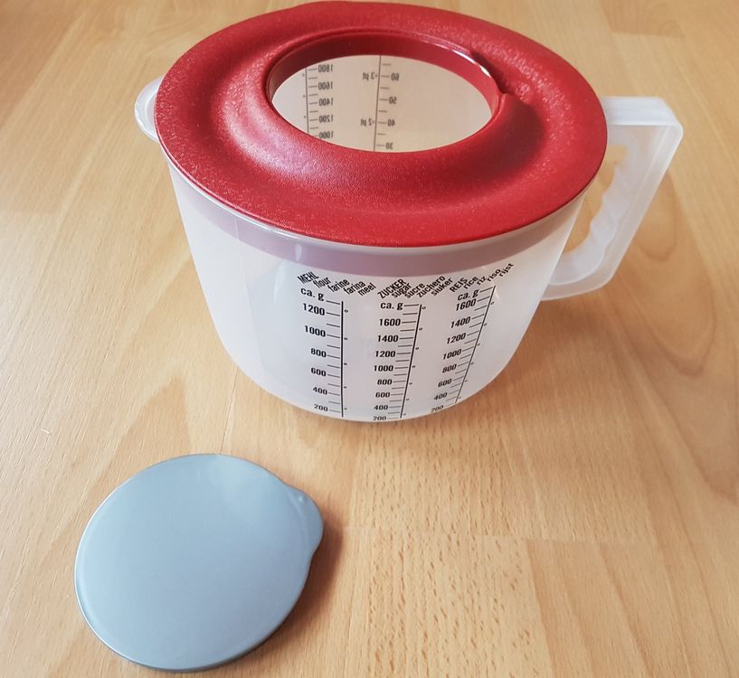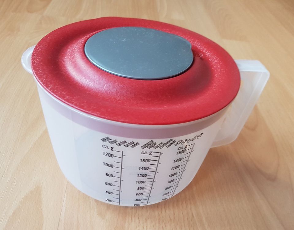 Mann, dieser Messbecher ist echt vielseitig! Mit 2 Liter Fassungsvermögen und zwei Deckeln - einmal als Spritzschutz mit Mixer-Öffnung, einmal als Vollverschluss. Perfekt zum Abmessen von Mehl, Zucker, Reis, aber auch als Rührschüssel für Teig oder Sahne. Der Anti-Rutsch-Ring am Boden sorgt für sicheren Stand. Aus BPA-freiem Kunststoff, 23x18x13,5 cm groß. Ideal zum Aufbewahren im Kühlschrank. Macht das Kochen und Backen so viel einfacher - ein echter Allrounder für jede Küche!