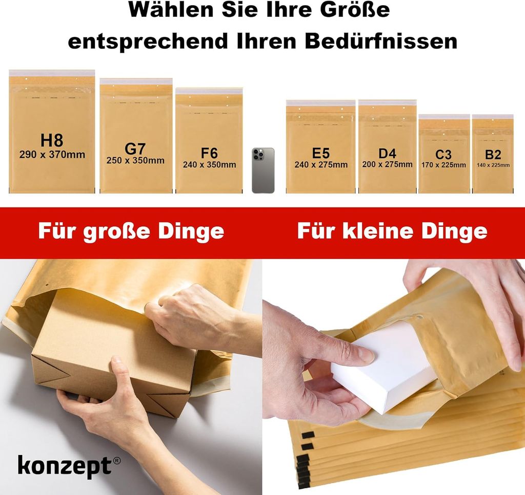 Du verschickst öfter mal kleine Sachen und willst, dass sie sicher ankommen? Die KONZEPT Luftpolsterumschläge sind perfekt dafür! Im Set mit 50 Stück, Größe DIN F6 (240x350 mm), passen in die meisten Briefkästen. Die Umschläge sind selbstklebend - einfach Lasche abziehen und zuklappen, fertig ist der sichere Verschluss. Die blasengefüllten Wände polstern deine Inhalte super gegen Stöße und Druck. Egal ob Briefe, Unterlagen, CDs, Fotos, Bücher, Kleidung, Elektronik-Teile, Schmuck oder Kosmetik - alles ist gut geschützt. Die Umschläge sind sogar wetterbeständig! Spezielles Kraft-Papier (70g/m²) mit 50-Mikron-Luftpolsterfolie innen schützt vor Feuchtigkeit und Frost. Das TRI-FIX System gibt dir drei Verschluss-Optionen: Lochung für Klammern (für 'Offene-Sendung' in DE), starken HOTMELT-Kleber (6mm mit 12mm-Blende) für schnelles Verkleben, oder transparentes Klebeband für mehrmaliges Öffnen. Die Verpackung ist robust aus Karton (340g/m²), kannst du sicher stapeln. Und umweltfreundlich sind sie auch - recyclingfähig! Also, ob für dein Business oder privat - mit diesen Umschlägen machst du nix verkehrt.