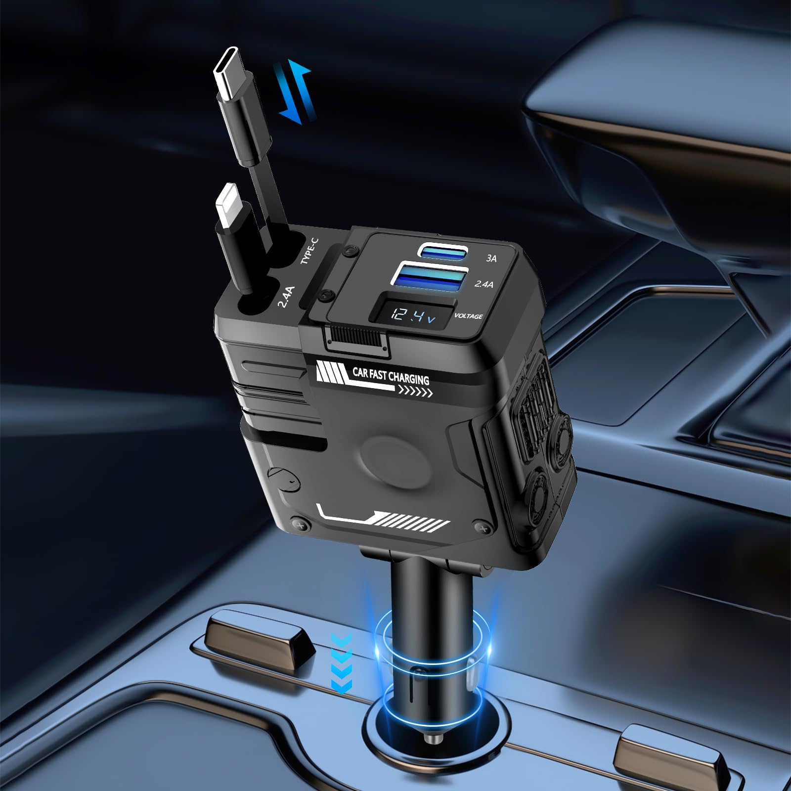 69W USB C Auto Ladegerät Mit Einziehbarem Kabel - 4-in-1 Schnellladegerät Für IPhone & Android