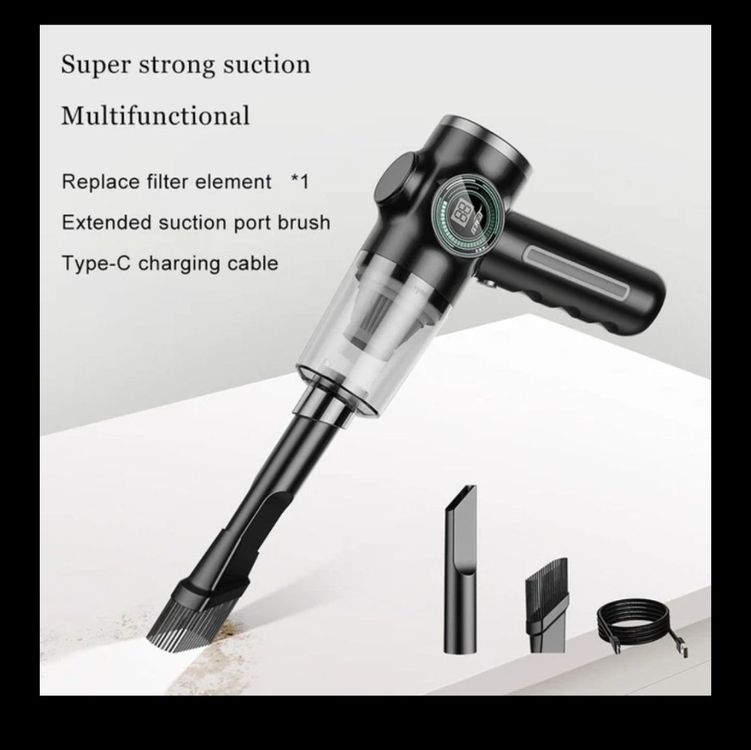 Dieser kleine Kraftprotz ist dein neuer bester Freund für alle Reinigungsarbeiten! Mit 15000 Pa Saugkraft saugt er Krümel, Tierhaare und Staub einfach weg - ob im Auto, auf der Tastatur oder in Sofaritzen. Der 4000 mAh Akku hält bis zu 30 Minuten durch, und das beste: Ein Knopfdruck entleert den 450 ml Behälter! Aber das ist noch nicht alles: Als Gebläse pustet er Staub von Regalen, als Aufpumpe bläst er Luftmatratzen auf und beim Camping entfacht er sogar das Feuer. Zwei Leistungsstufen und waschbare HEPA-Filter machen ihn zum echten Allrounder. Kabellos, leicht und super handlich - endlich macht Saubermachen Spaß!