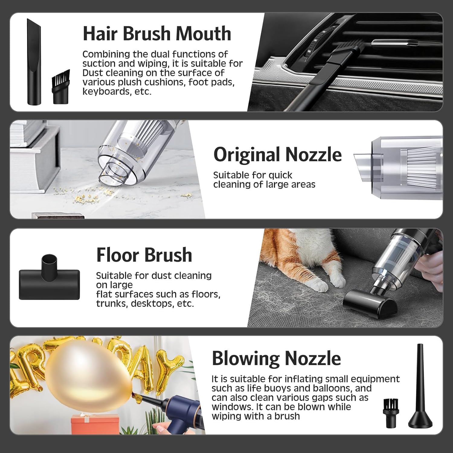 Schluss mit Staub und Krümeln in Auto und Wohnung! Dieser kabellose Handstaubsauger ist dein neuer Reinigungsheld. \\n\\nMit stolzen 6000Pa Saugkraft saugt er alles weg: Tierhaare, Krümel, Staub - einfach alles! Der 4000mAh Akku hält bis zu 30 Minuten durch, und in 3 Stunden ist er wieder voll geladen. \\n\\nDas 3-in-1 Wunder: \\n1. Staubsauger für Auto, Sofa, Küche \\n2. Luftpumpe für aufblasbare Spielzeuge \\n3. Staubbläser für Computer und Tastaturen \\n\\nDas praktische Zubehör macht ihn vielseitig: \\n- Lange Düse für enge Stellen \\n- Bürstenaufsatz für Polster \\n- LED-Licht für dunkle Ecken \\n\\nDer HEPA-Filter ist waschbar - umweltfreundlich und spart Geld. Mit nur 377 Gramm ist der Sauger super leicht und handlich. \\n\\nPerfekt für: \\n- Auto-Innenreinigung \\n- Tierhaare entfernen \\n- Schnelle Küchenreinigung \\n- Computer und Elektronik \\n\\nMach Reinigen zur leichten Aufgabe - jederzeit und überall!
