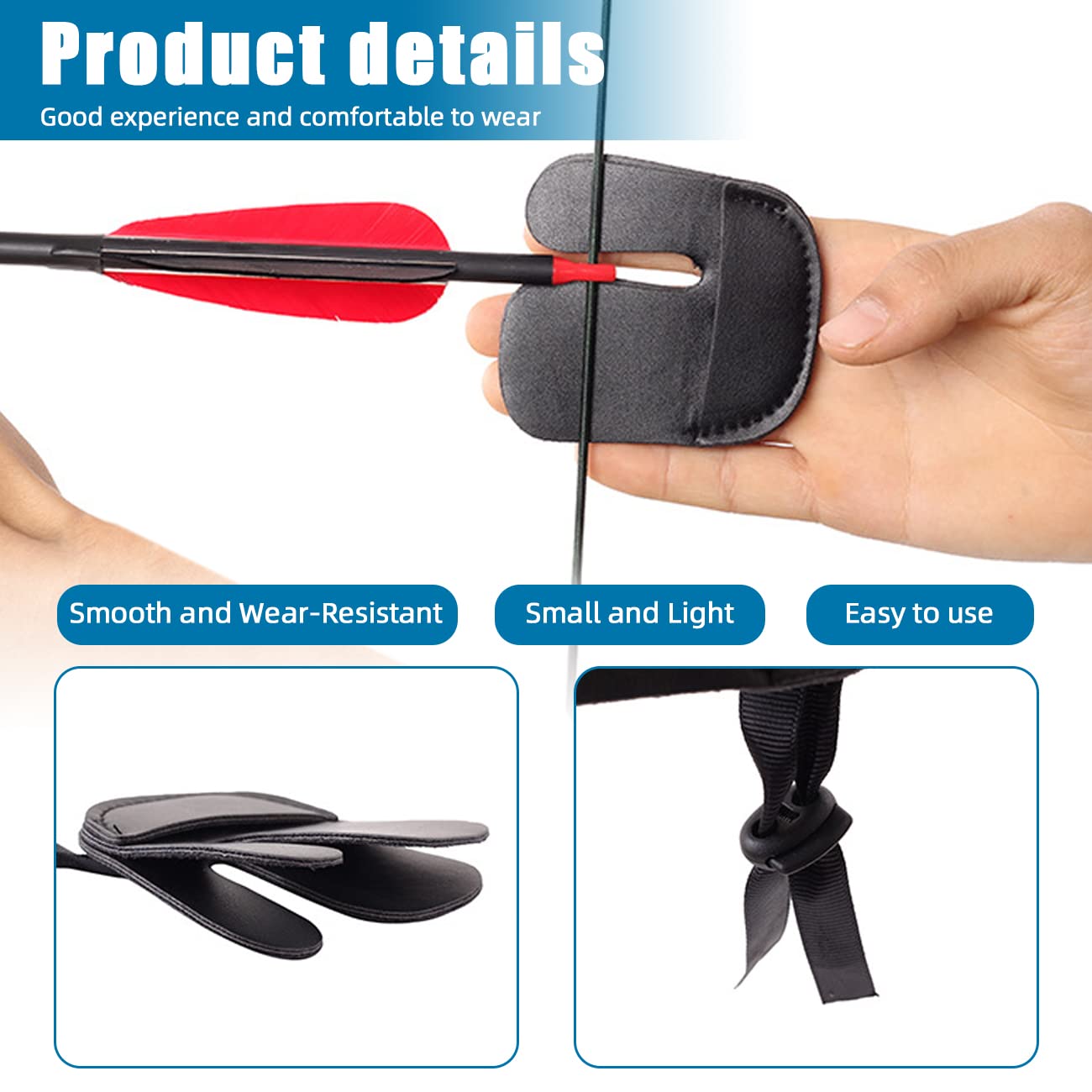 Der passende Handschuh schützt deine Finger beim Ziehen der Sehne. Auch er ist für Rechts- und Linkshänder geeignet und hat eine verstellbare Handgelenkschlaufe plus Gummiband für perfekten Sitz.