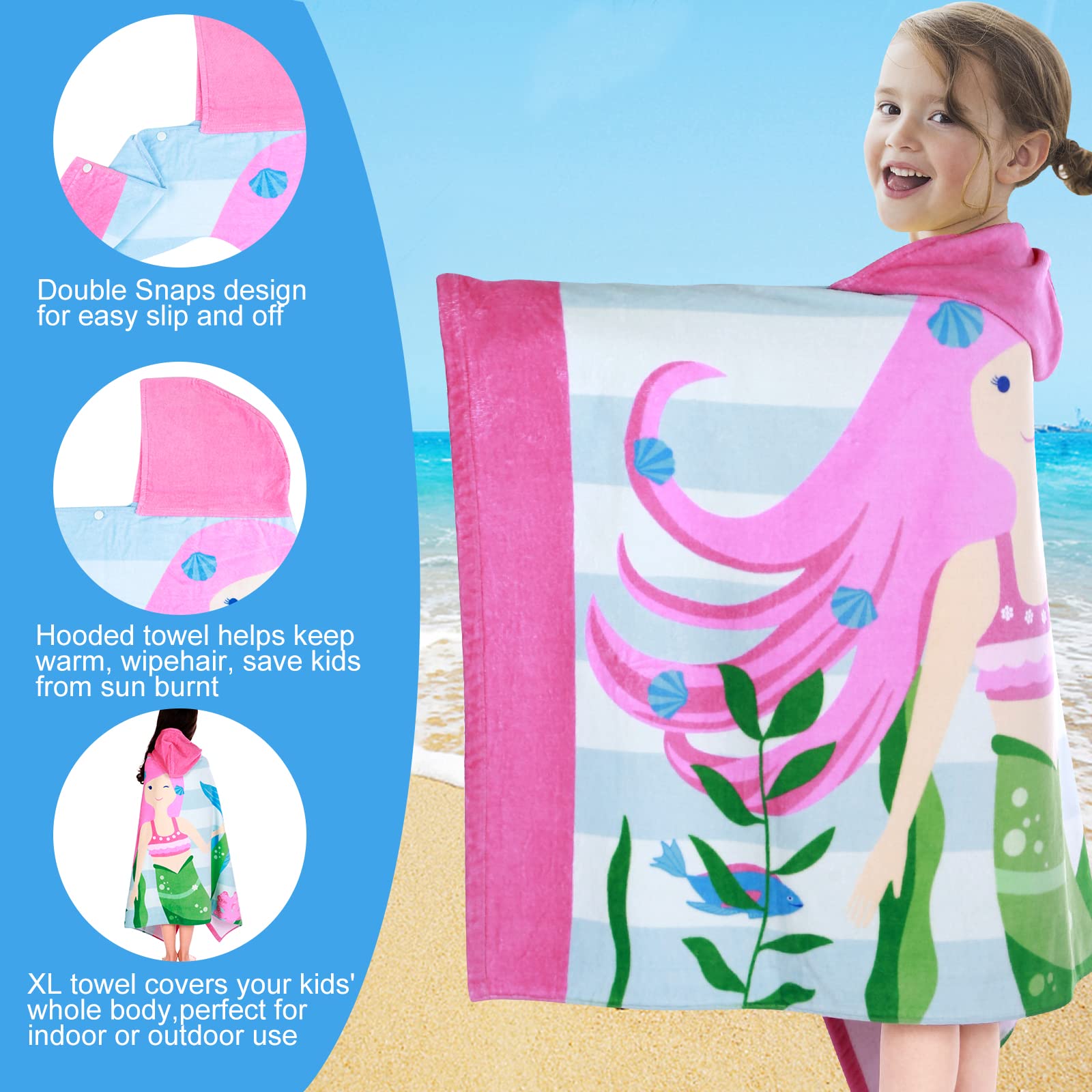 Nach dem Schwimmen schnell ins Handtuch und warm bleiben? Mit diesem süßen Kapuzenhandtuch von MOEMOE BABY klappt's perfekt! Es ist aus 100% weicher Baumwolle, hautfreundlich und ohne Schadstoffe - ideal für die zarte Kinderhaut. Mit 70x60 cm ist es genau die richtige Größe für Kinder von 3 bis 8 Jahren. Das besondere Design: Die Kapuze ist seitlich angenäht, dein Kind muss also nicht mit dem Kopf durch eine Öffnung - einfach umhängen und mit den praktischen Druckknöpfen schließen. Die Arme sind frei beweglich, und das Handtuch saugt super schnell Wasser auf. Es ist waschmaschinenfest, trocknet fix und gibt's in vier niedlichen Cartoon-Mustern zur Auswahl: Astronaut, Dinosaurier, Meerjungfrau und Tänzerin. Perfekt für Strand, Pool, Schwimmkurs oder zu Hause. Ein tolles Geschenk, das nicht nur praktisch ist, sondern auch mega stylisch aussieht!
