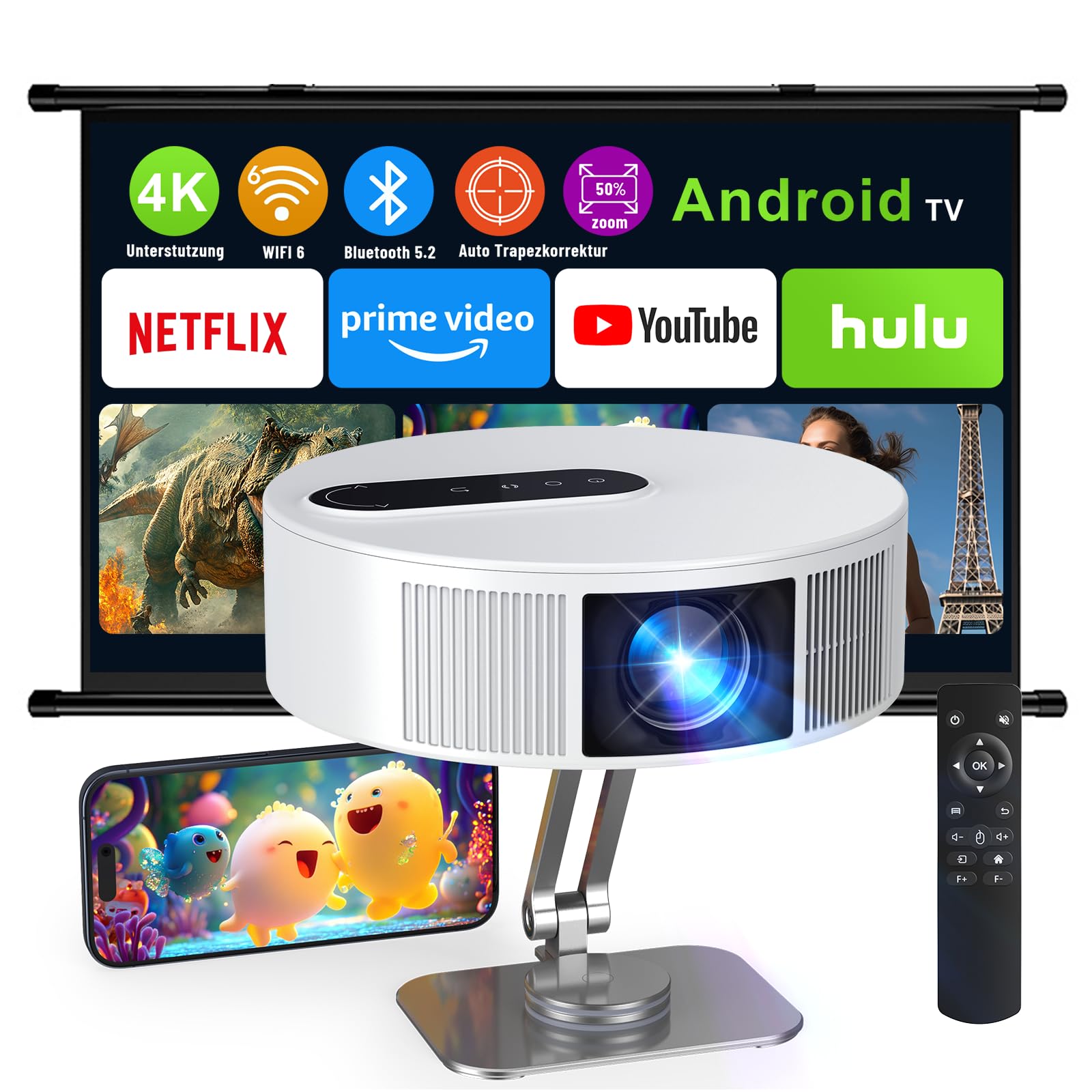 Mega - ein Beamer der alles kann! 4K UHD Auflösung mit 1500 ANSI Lumen für gestochen scharfe Bilder. Und das Beste: Mit Karaoke-Funktion inklusive 2 drahtlosen Mikrofonen! Perfekt für Filmabende oder Partys. Mit Android Smart TV, WiFi 6 und Bluetooth 5.2 - stream einfach Netflix, YouTube oder was du willst. Autofokus und automatische Trapezkorrektur - kein langes Rumgefummel mehr. NFC für einfaches Verbinden. HDMI und USB Anschlüsse sind auch dabei. Ob drinnen oder draußen - damit wird jeder Abend zum Event. Einfach aufstellen und loslegen!