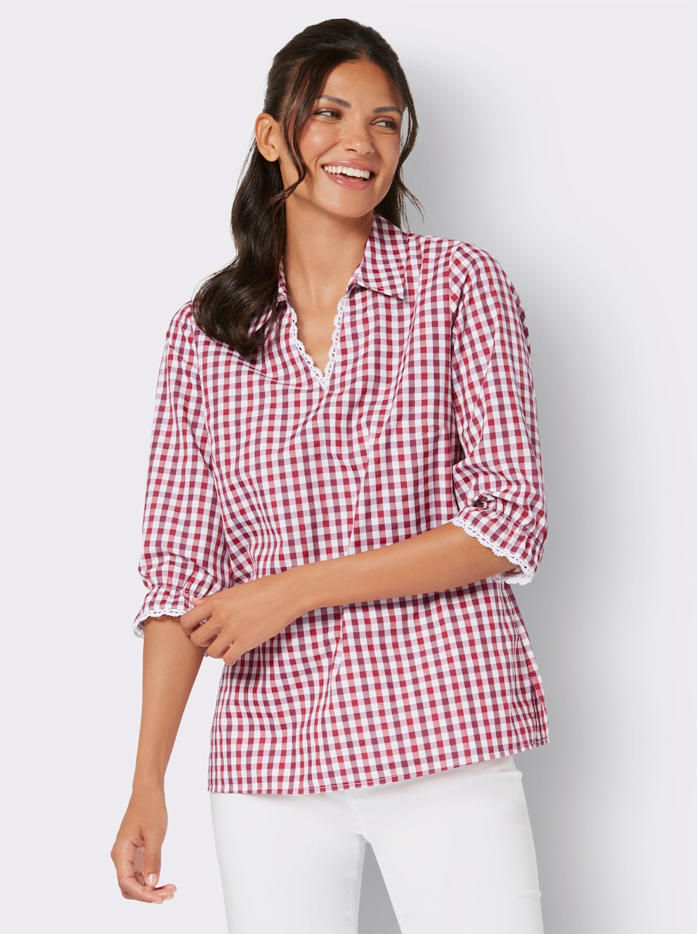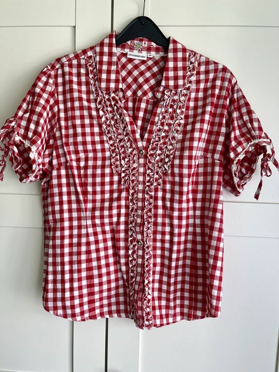 Dirndl-Feeling pur! Diese wunderschöne Trachtenbluse 'Jasmin' in rot/weiß kariert ist der absolute Hingucker auf jedem Oktoberfest oder Volksfest. Aus hochwertiger Baumwolle gefertigt, liegt sie angenehm auf der Haut und bietet maximalen Tragekomfort. Der elegante Stehkragen und die liebevoll verarbeiteten Häkelspitzen im Brustbereich verleihen ein romantisches Dekolleté. Die kurzen Puffärmel und die taillierte Passform betonen deine Figur perfekt. Besonders hübsch: die metallenen Herzknöpfe an der Knopfleiste! Vielseitig kombinierbar - nicht nur zur Lederhose, sondern auch zu Jeans oder Chino-Hosen. Perfekt für festliche Anlässe, aber auch für die Arbeit oder eine gemütliche Wanderung. Erhältlich auch in reinem Weiß - such dir deinen Lieblingslook aus! Hochwertige Verarbeitung und zeitloses Design zu einem fairen Preis. Mit dieser Bluse bist du immer stilvoll unterwegs und trägst ein Stück Tradition. Einfach anziehen und den Tag genießen - ob auf dem Fest oder im Alltag!