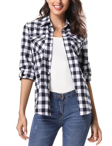 Damen Langarmshirt Karo Bluse - Loose Fit Büro Bluse Mit Knopfleiste