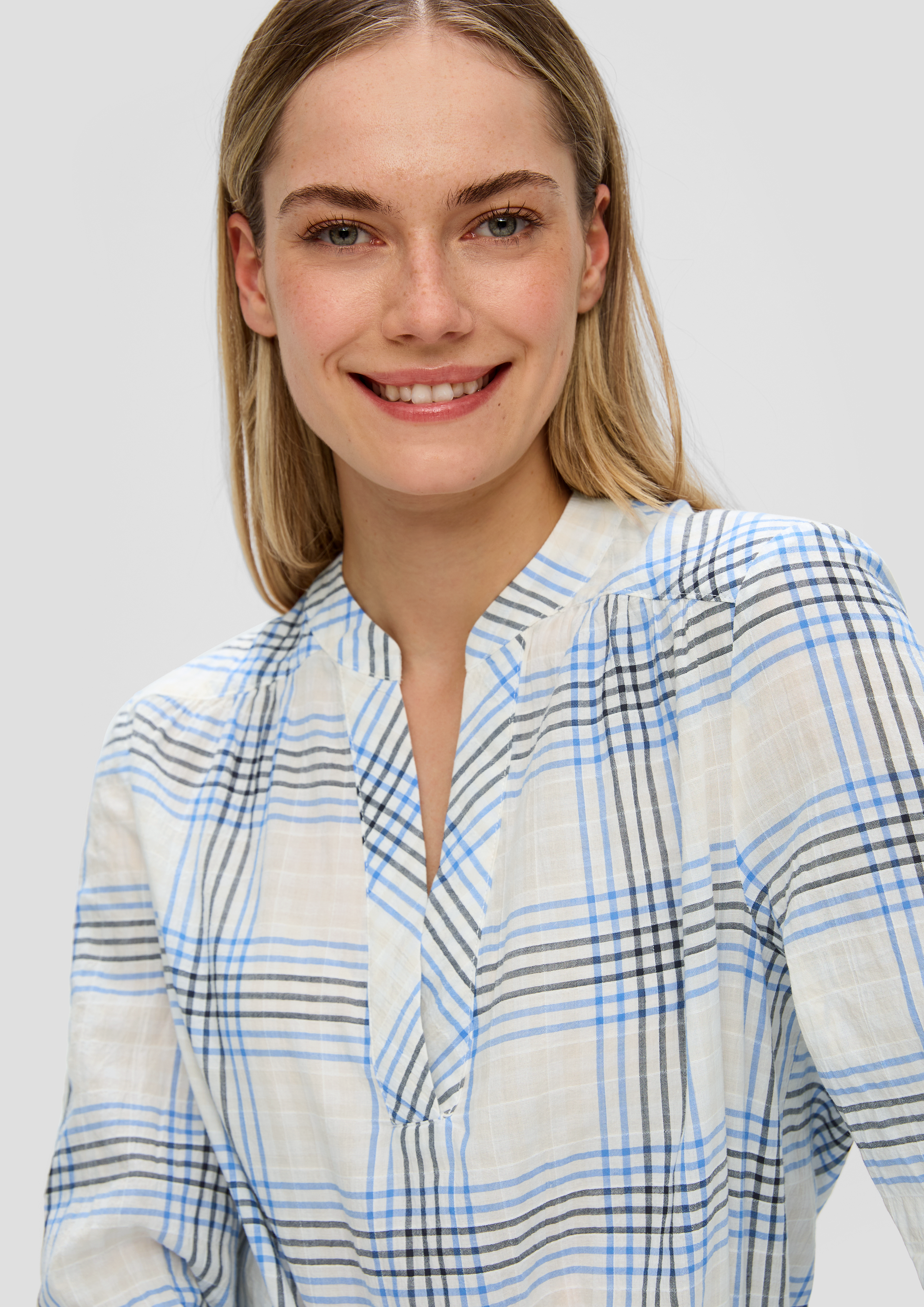 Diese wunderschöne Karo-Bluse von s.Oliver ist ein echter Allrounder für deinen Kleiderschrank! Aus fließendem Stoff mit femininem Faltendetail am Rücken und praktischen elastischen Ärmelbündchen. Die Kombination aus Rundhals- und V-Ausschnitt macht sie besonders vielseitig kombinierbar. In Navy mit klassischem Karomuster - zeitlos schön und immer angesagt. Die reguläre Passform sitzt perfekt und der verlängerte Rückensaum sorgt für optimale Bewegungsfreiheit. Ob im Büro, beim Stadtbummel oder am Abend - diese Bluse macht immer eine gute Figur!