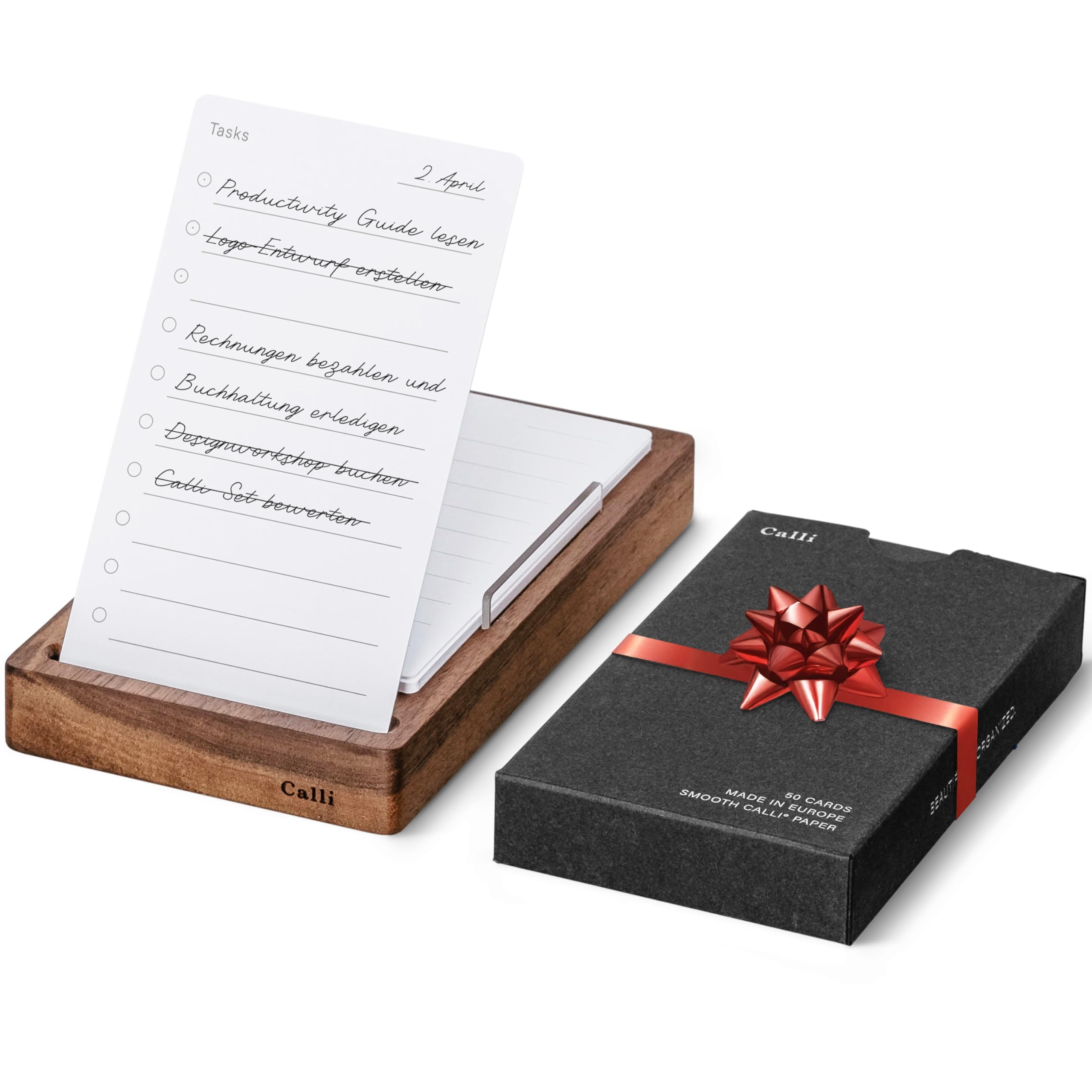 Nie wieder Chaos auf dem Schreibtisch! Dieser edle Kartenhalter aus massivem Ahorn- oder Walnussholz bringt Ordnung in deine Aufgaben. Enthalten sind 45 hochwertige A7-Karten aus 300g/m² Papier. Vorne trägst du deine Tagesziele ein, hinten auf der gepunkteten Seite machst du Skizzen oder Notizen. Einfach Aufgaben abhaken und zur nächsten Karte wechseln. Der Ständer hat zwei Halte-Schlitze für aktuelle und längerfristige Projekte. Ein Deck reicht für 2-3 Monate - danach einfach nachkaufen. Perfekt für Homeoffice oder Büro, um Prioritäten zu setzen und produktiver zu arbeiten. Mach deinen Arbeitsplatz zum organisierten Traum!