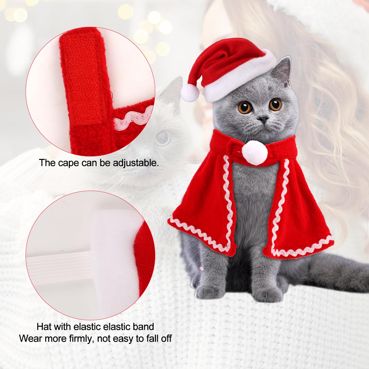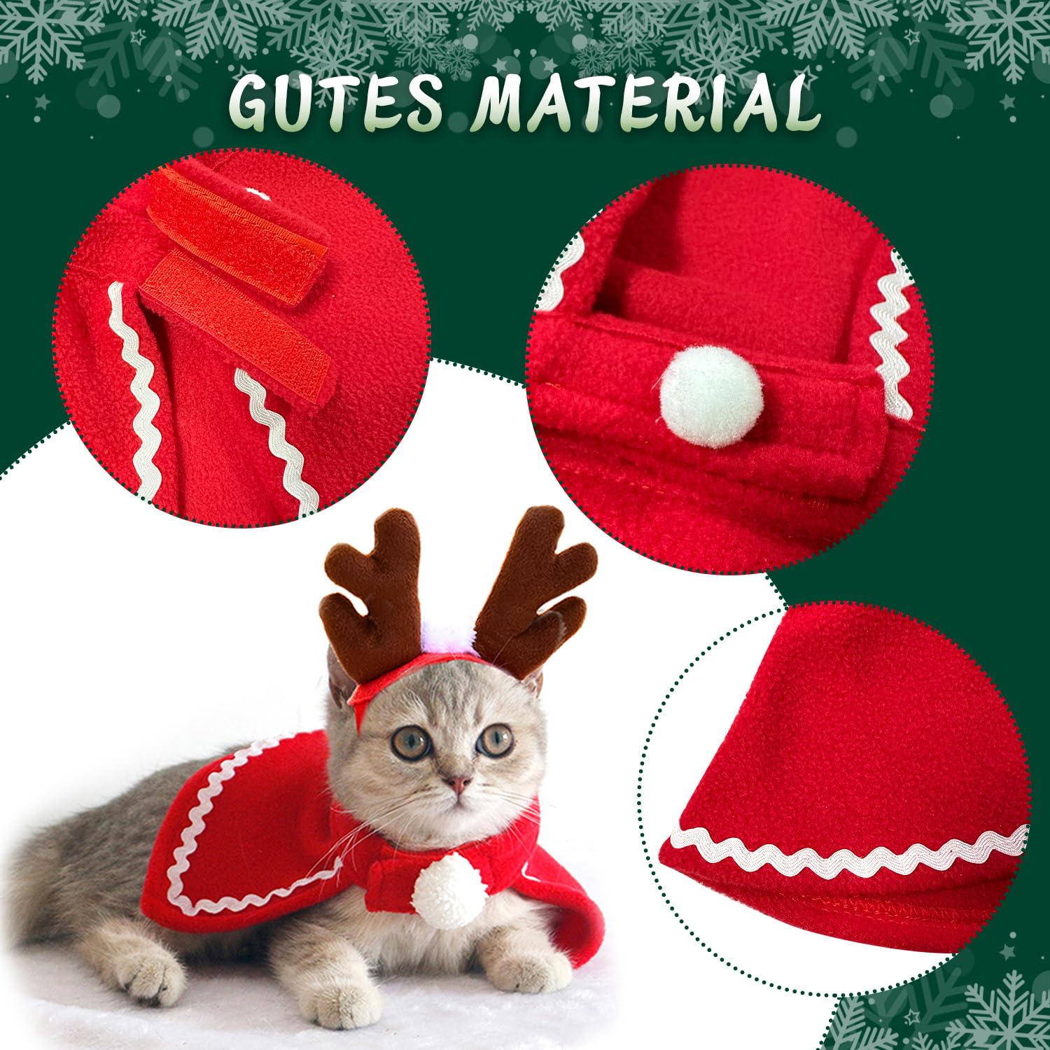 Dein Haustier wird zum Weihnachtsstar! Dieses 4-teilige Kostüm-Set ist einfach niedlich. Enthält Weihnachtsmann-Mütze, verstellbaren Schal und putziges Geweih - alles was du für perfekte Weihnachtsfotos brauchst. Aus weichem Fleece-Material, angenehm für deine Katze oder deinen kleinen Hund zu tragen. Die Mütze hat nen elastischen Bund für nen sicheren Sitz, passt für Kopfumfänge von 8-12 Zoll. In klassischen Weihnachtsfarben - rot-weiß gestreift - einfach festlich! Nicht nur für Weihnachten, auch für Mottopartys, Geburtstage oder einfach so zum Spaß. Auch für Kaninchen oder sogar Puppen geeignet! Einfach anziehen und schon ist dein Liebling der Hingucker auf jeder Feier. Waschbar und wiederverwendbar - hält also auch nächstes Jahr noch. Perfekt als Geschenk für Tierliebhaber oder einfach um selbst ne Freude zu haben. Mach die Feiertage noch besonderer mit nem tierisch guten Kostüm! Deine Katze oder dein Hund wird vielleicht nicht verstehen warum, aber du wirst nen Heidenspaß daran haben!