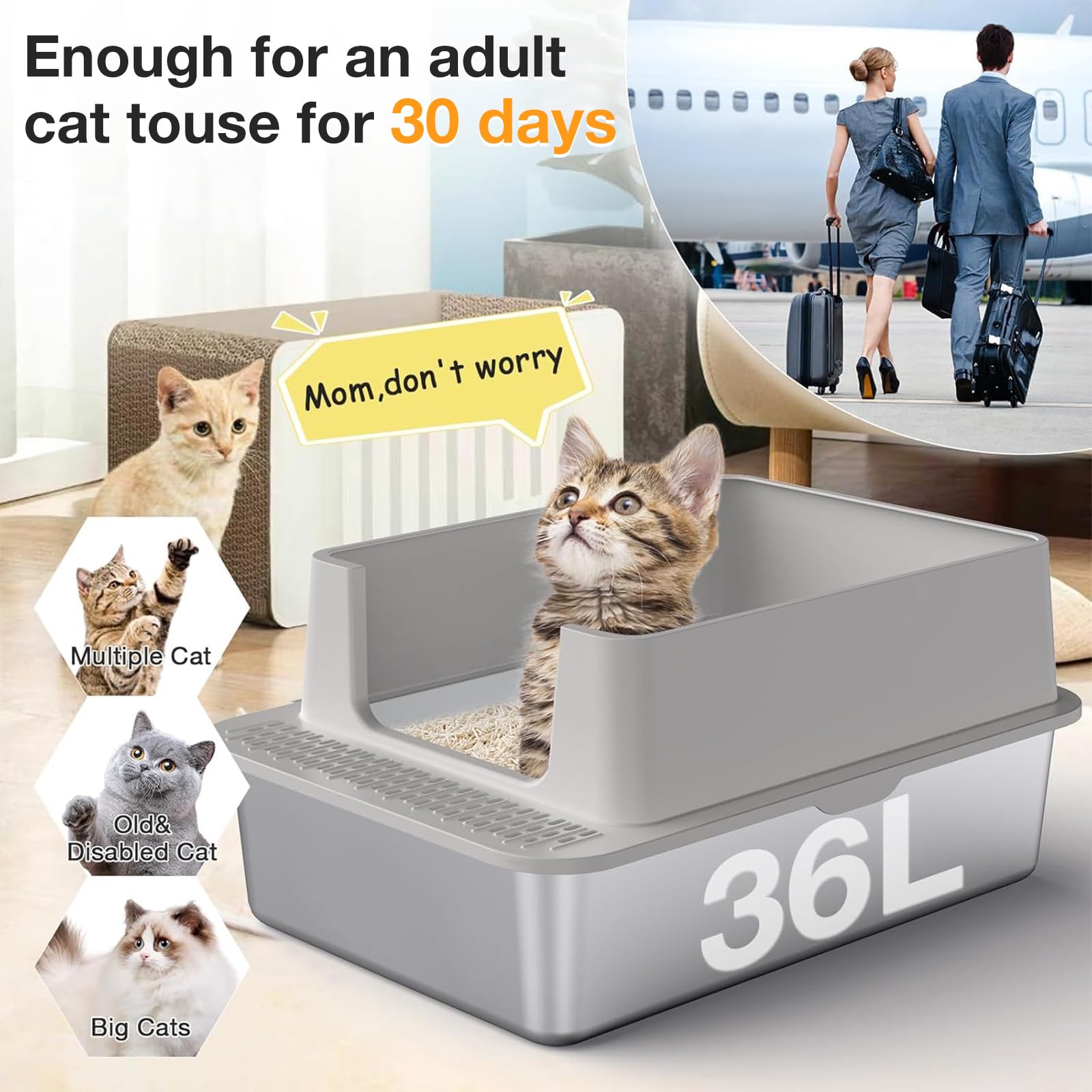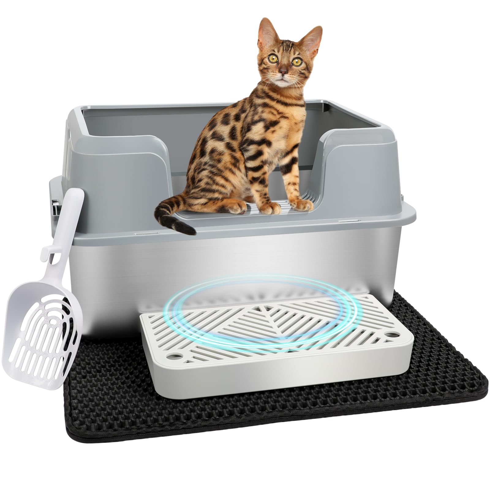 Endlich eine Katzentoilette, die wirklich alles kann! Aus hochwertigem Edelstahl und Kunststoff, super robust und kratzfest. Mit 60x40x39 cm Maßen bietet sie genug Platz für Katzen aller Größen. Das coole 2-in-1 Design: abnehmbare Abdeckung und zwei Eingänge - vorne eine Klapptür und oben ein rundes Loch. So findet jede Katze ihren Lieblingseingang! Innen fasst sie stolze 30 Liter Katzenstreu. Mitgeliefert werden Pedal und Schaufel für einfache Reinigung. Die selbstschließende Tür hält Gerüche zuverlässig drin. Perfekt für Wohnzimmer, Schlafzimmer oder Balkon. Deine Katze wird's lieben - und deine Nase auch!