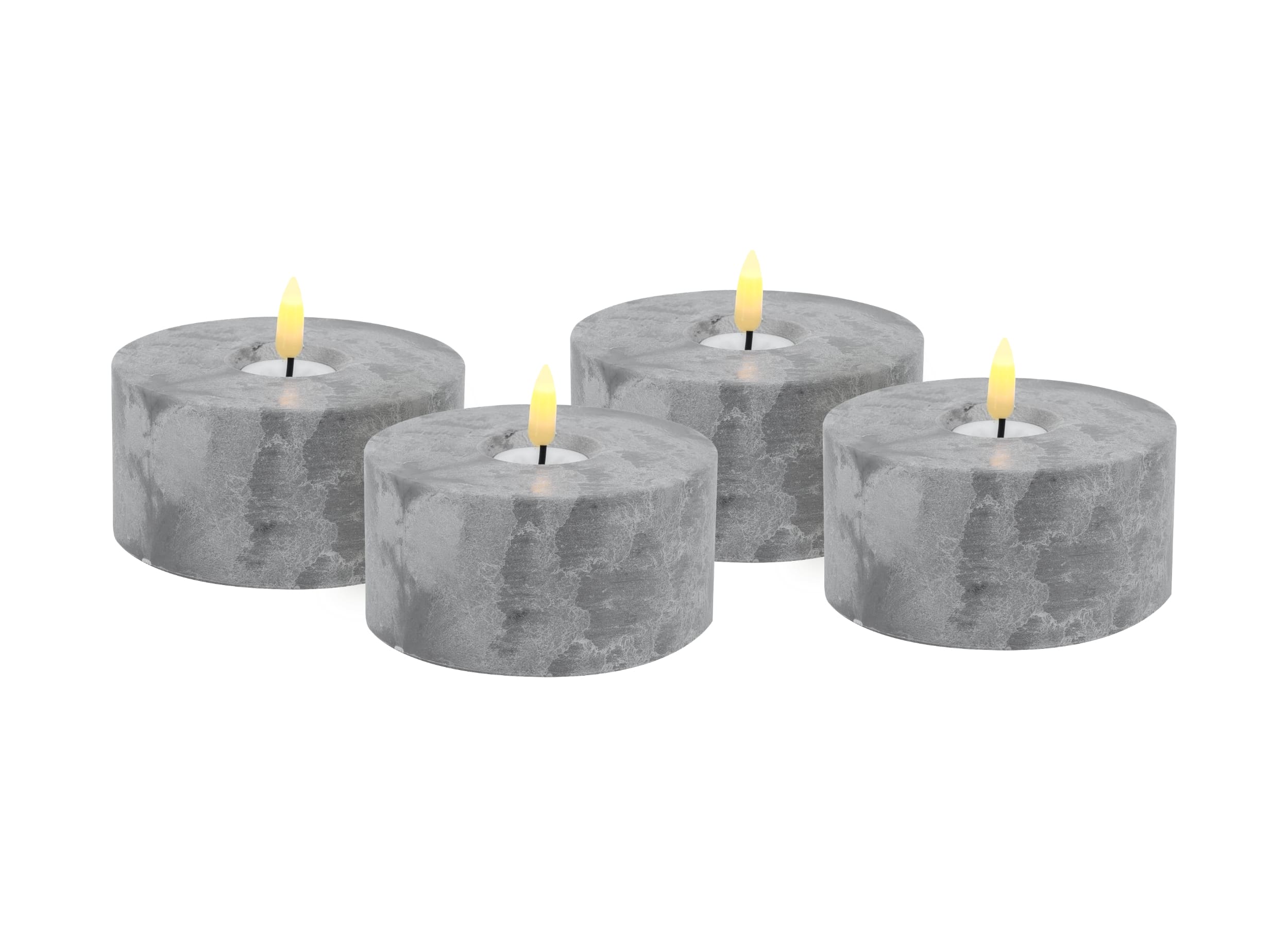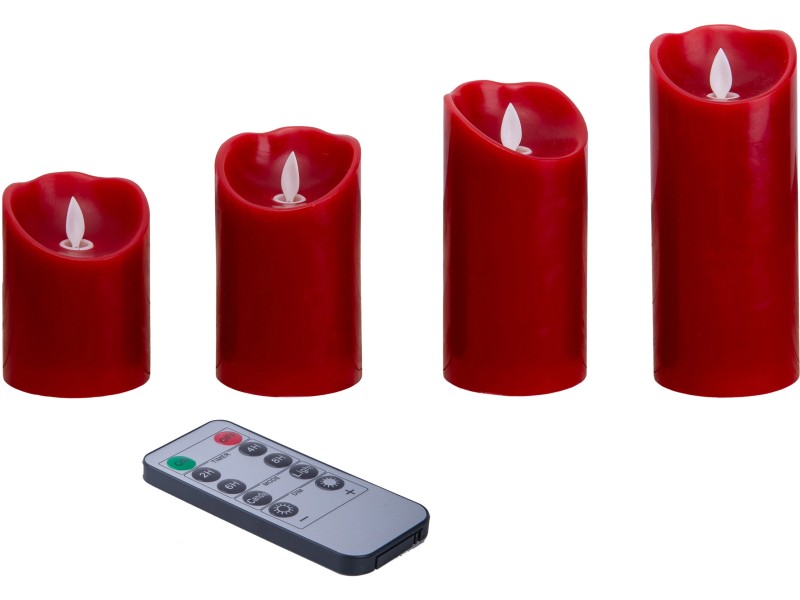Im Set: 2 Stumpenkerzen 7,5x10 cm und 2 Stumpenkerzen 7,5x15 cm. Mit Fernbedienung steuerbar - ein-/ausschalten, dimmen und Timer auf 4 oder 8 Stunden einstellen. Batterien (8x AA) sind schon dabei!