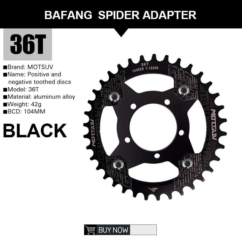 E-Bike-Fans, aufgepasst! 🚴♂️ Dieses Kettenblatt ist speziell für Bafang Mittelmotoren entwickelt und bringt deine Performance aufs nächste Level! Erhältlich in 34T, 36T, 38T oder 40T - such dir deine perfekte Größe aus!\n\nDas schmal-breite Design ist der absolute Game-Changer: Es minimiert Kettenabwürfe deutlich! Egal ob bergauf, im Gelände oder auf unebenen Wegen - deine Kette bleibt, wo sie hingehört.\n\nAus CNC-gefästeter 6061-Aluminiumlegierung gefertigt, ist es super leicht aber extrem stabil. Das bedeutet: bessere Effizienz und mehr Komfort auf langen Touren!\n\nKompatibel mit Bafang M500, M510, M600, M620 (CAN) und M420 Motoren. Der mitgelieferte Spider-Adapter macht die Installation zum Kinderspiel! Für den M620 brauchst du die beiliegende Dichtung - alles dabei!\n\nDie 104BCD Aufnahme passt perfekt und die schwarze Farbe sieht einfach klasse aus! Ein echter Hingucker an deinem E-Bike!\n\nTipp: Nicht blind auf Standard-Größentabellen verlassen - mess lieber dein aktuelles Kettenblatt nach oder frag einen Fachmann!\n\nEinfach das alte Kettenblatt ab, das neue drauf - und schon genießt du ein deutlich verbessertes Fahrgefühl! Weniger Ärger, mehr Fahrspaß! 💪