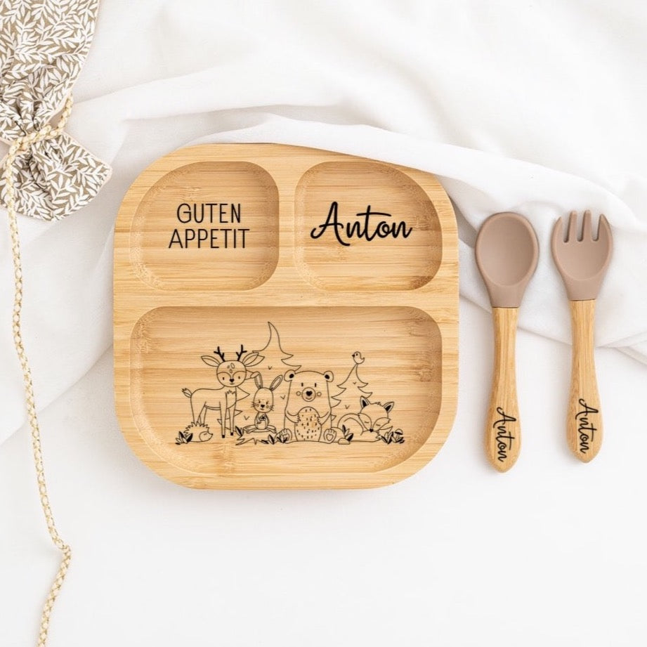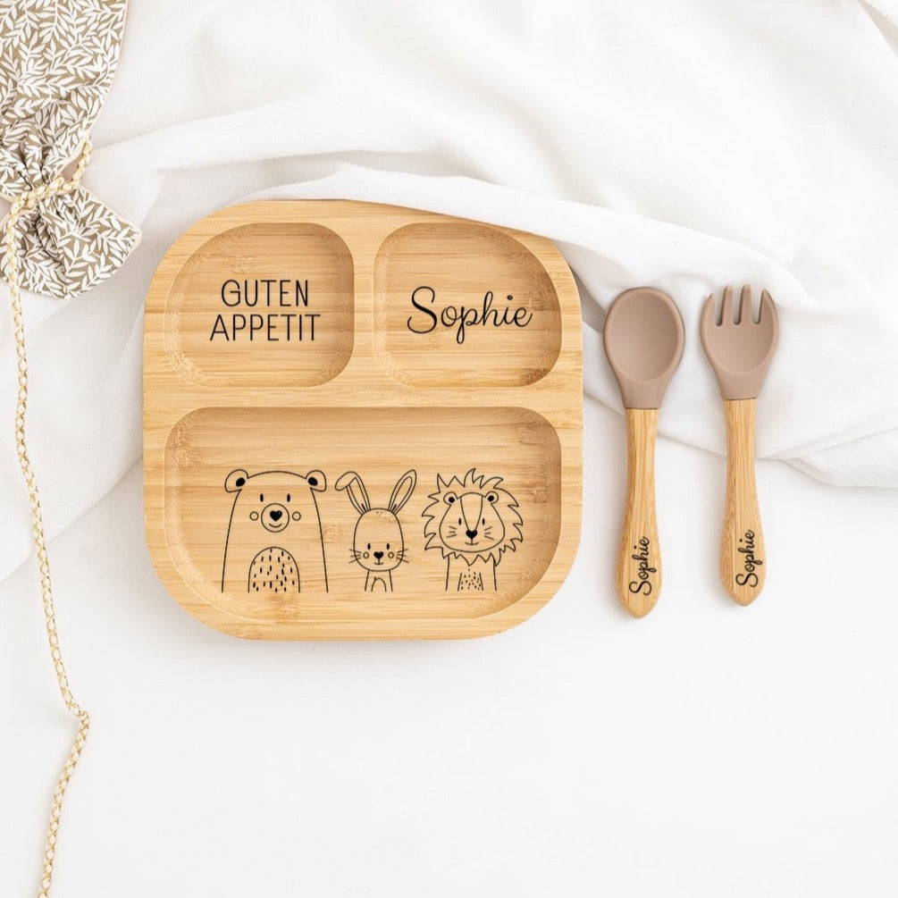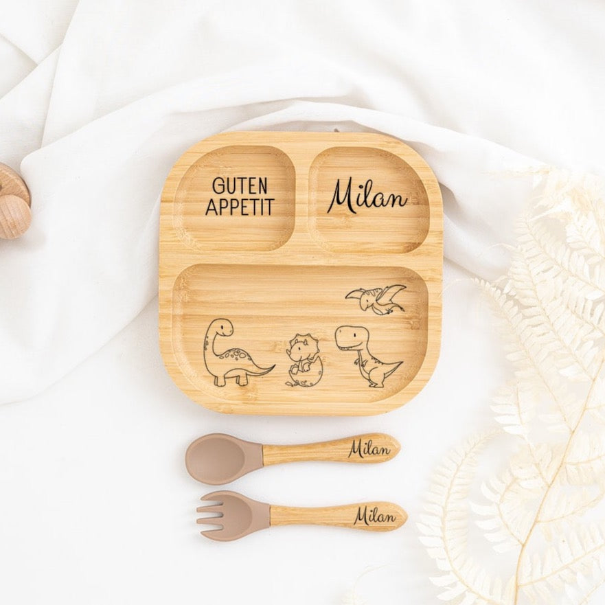 Kidsmood Kinderteller Mit Saugnapf & Personalisiertem Bambus-Besteck - Perfektes Geschenk Zur Geburt Oder Taufe