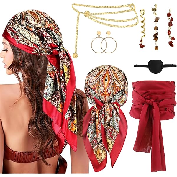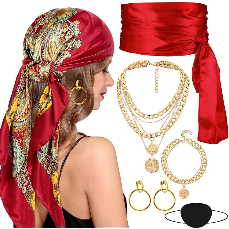 Ahoy, Piraten-Fans! Dieses 5-teilige Accessoire-Set macht dich zur perfekten Piratin! Enthalten sind: Piraten-Kopftuch (90x90cm), coole Schärpe (365x25cm), stylische Halskette, mysteriöse Augenklappe, Ohrring und Armband. Perfekt für Karneval, Halloween, Mottopartys oder Theateraufführungen. Die Teile kannst du auch einzeln im Alltag tragen - das Kopftuch als Halstuch, die Schärpe als Gürtel. Super vielseitig und wirklich gut verarbeitet. Einfach anziehen und du bist bereit für dein nächstes Abenteuer! Auch ein tolles Geschenk für Freunde oder Familienmitglieder. Ob für eine Party oder einfach mal zum Spaß - mit diesem Set bist du der Star jeder Veranstaltung!
