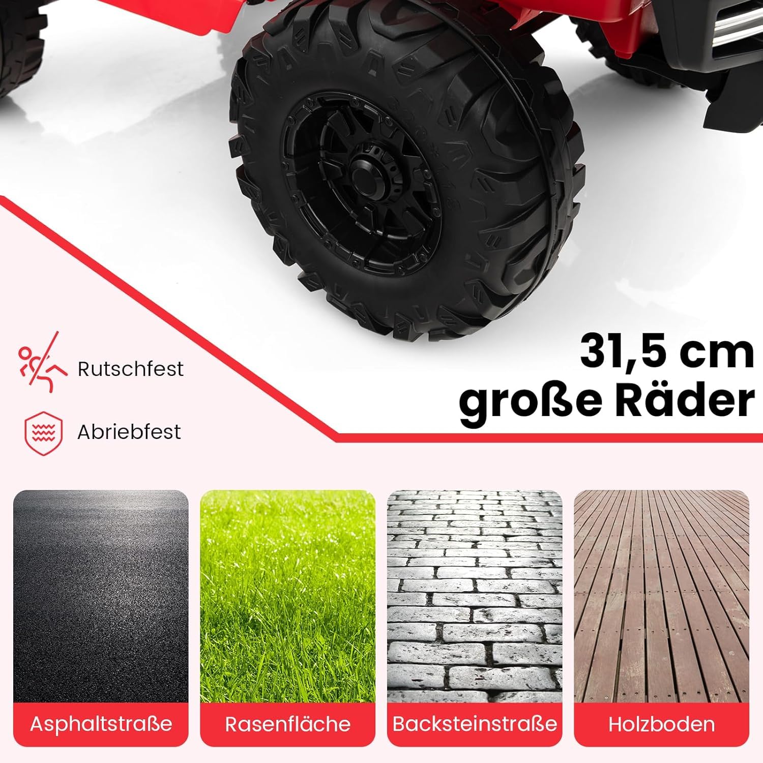 Das ultimative Elektroauto für die Kleinen! 24V stark, mit zwei Sitzen - da können Geschwister oder Freunde gemeinsam fahren. Zwei Geschwindigkeitsstufen: 2,6-3 km/h für die Anfänger und 5,5-6 km/h für die Fortgeschrittenen. Sanfter Anfahrvorgang - keine ruckartigen Starts die erschrecken. Mit Fernbedienung - so können die Eltern notfalls eingreifen oder den Kleinen beim Lenken helfen. Coole LED-Leuchten für mehr Sicherheit bei Dämmerung, Hupe und Musik - was will man mehr? Aus robustem PP-Material und Metall gefertigt, hält bis zu 35kg aus. Die 4 großen Räder sind rutschfest und abriebfest - fahren auf fast jedem Untergrund. Mit digitalem Display das den Batteriestand anzeigt. Nach dem Aufladen bis zu 2 Stunden Fahrspaß! Für Kinder von 3-8 Jahren perfekt - die werden Augen machen wenn sie ihr eigenes Auto bekommen! Perfekt für Geburtstage, Weihnachten oder einfach so - ein Geschenk das garantiert ankommt!