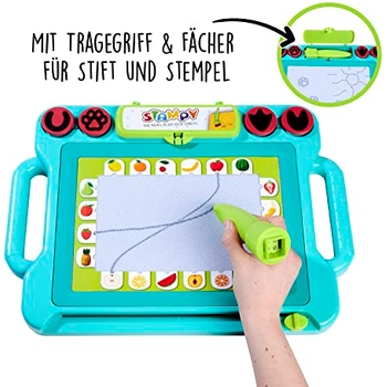 Wow, was für ein cooles Spielzeug! Die Eucomir Magnet-Zaubertafel bringt Kinderaugen zum Leuchten. Mit 4 bunten Farben (blau, rot, gelb, grün) und 4 niedlichen Stempeln können die Kleinen ihrer Kreativität freien Lauf lassen. Das Beste: Einfach mit dem Radiergummi wischen und schon ist die Tafel wieder blank - kein Chaos mit Stiften und Papier! Aus sicherem ABS-Kunststoff und super robust. Die 4 abnehmbaren Füße ermöglichen 3 verschiedene Positionen: vertikal, geneigt oder flach - perfekt für die richtige Haltung. Ideal für unterwegs im Auto, Flugzeug oder Restaurant. Fördert spielerisch die Schreib- und Malfertigkeiten und die Farbwahrnehmung. Ein tolles Geschenk für Kinder von 3-7 Jahren zu Geburtstag, Weihnachten oder einfach so. Stundenlangen Spielspaß garantiert!
