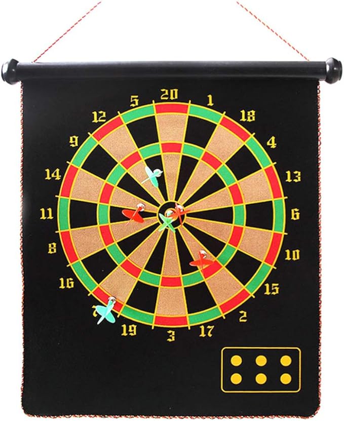 Wow, diese magnetische Dartscheibe von ROLEDY macht richtig Spaß und ist dabei total sicher für Kinder! Keine scharfen Spitzen, nur Magnete - da können die Kleinen ohne Bedenken spielen wie die Großen. Das Set hat alles was das Herz begehrt: 12 Magnet-Dartpfeile und sogar 6 Ersatzflügel, falls mal einer kaputt geht. Das geniale doppelseitige Design bietet zwei Spielmöglichkeiten: Klassisches Dart auf der einen Seite und spannendes Ziel-Bullseye-Spiel auf der anderen. Wichtig für den perfekten Spielspaß: Die Scheibe muss genau auf 1,72 Meter Höhe aufgehängt werden, sonst fallen die Pfeile ab! Die Magnete sind nämlich auf diesen Winkel optimiert. Perfekt für Kinder von 4-12 Jahren, aber auch Erwachsene haben ihren Spaß damit. Ob im Kinderzimmer, Wohnzimmer oder draußen im Garten - dieses Dartspiel ist immer eine gute Idee. Es fördert ganz nebenbei die Hand-Auge-Koordination und Konzentration. Einfach aufrollen und überall mitnehmen - ideal für Geburtstage, Familienabende oder Partys. Pflegeleicht: Einfach mit feuchtem Tuch abwischen (nicht wasserfest!) und vor direkter Sonne schützen. Ein super Geschenk für Jungen und Mädchen, das lange Freude bereitet!