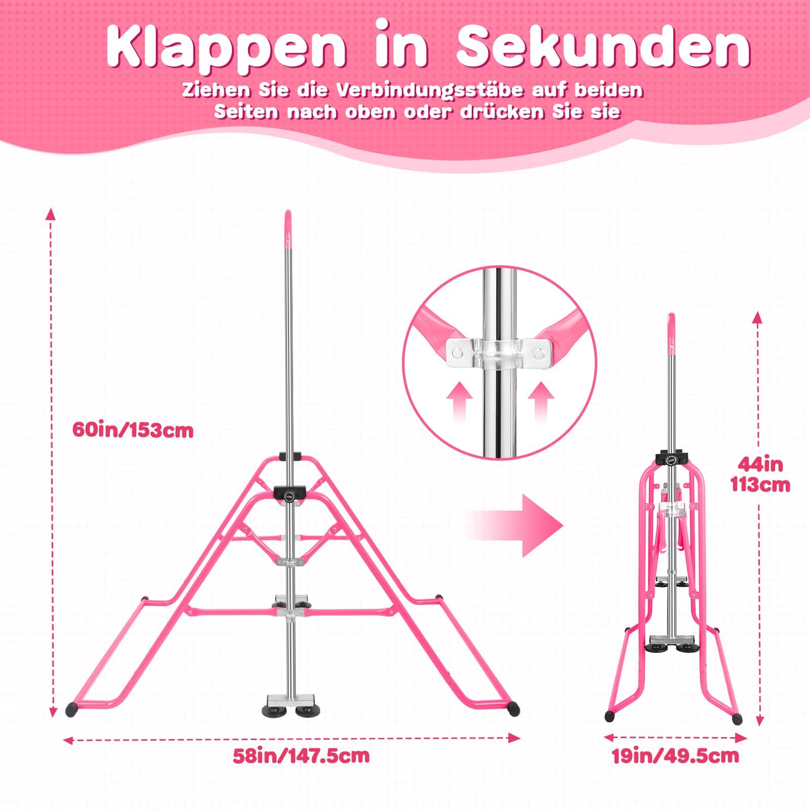 Wow, diese Gymnastikstange ist einfach perfekt für aktive Kinder! Mit 5 Höhenstufen von 113cm bis 153cm wächst sie super mit - passt für Kinder von 3-8 Jahren. Die rutschfesten Gummifüße sorgen für absolute Stabilität auf jedem Boden. Bis zu 70kg trägt sie - also auch für wildes Herumtoben geeignet! Das coole Rosa-Design finden Jungen und Mädchen gleichermaßen super. Und das Beste: In Sekunden zusammengeklappt und platzsparend verstaut! Die mitgelieferten Trapezringe machen doppelt Spaß - mal Stange, mal Ringe. Perfekt fürs Kinderzimmer, Garten oder Balkon. Macht endlich Schluss mit Langeweile und fördert ganz nebenbei Kraft, Gleichgewicht und Koordination. Einfach aufbauen - Werkzeug ist dabei! Das ideale Geschenk für Geburtstage oder Weihnachten - Spielspaß für Jahre!