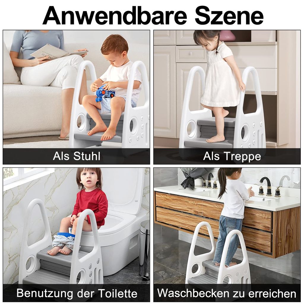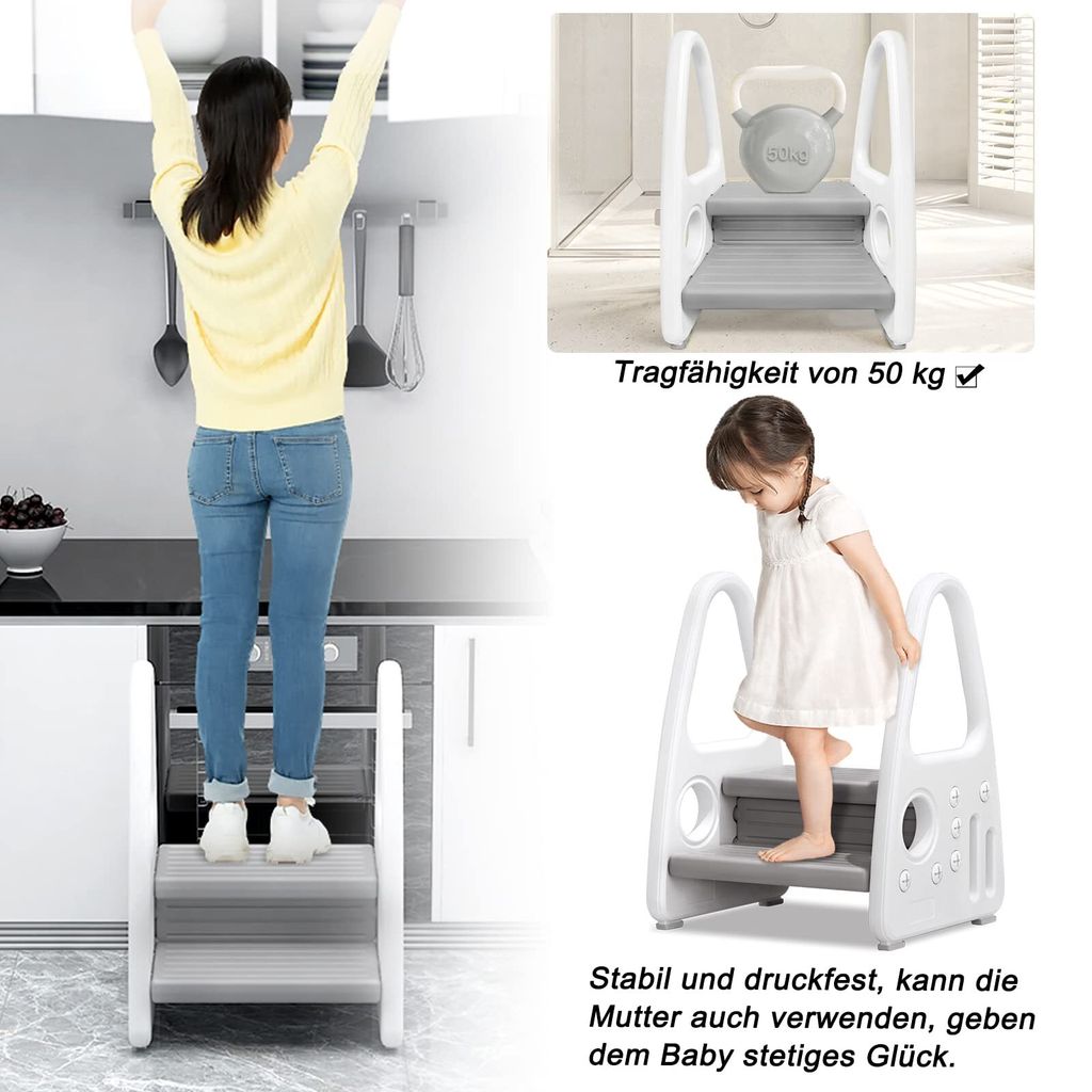 Jetzt kann dein Kind überall mithelfen! Dieser tolle 2-stufige Tritthocker von LARS360 macht dein Kind zum kleinen Helfer im Haushalt. Mit 61cm Höhe und zwei Stufen erreicht es problemlos Waschbecken, Toilette oder die Küchenarbeitsplatte. Die stabile Pyramiden-Struktur gibt sicheren Stand und die integrierten Griffe bieten zusätzlichen Halt. Rutschfeste Füße verhindern das Wegrutschen - Sicherheit geht vor! Aus robustem PP-Material, geruchlos und mit abgerundeten Ecken. Hält bis zu 50kg aus - da kann sogar Mama mal drauf stehen. Für Kinder von 2-5 Jahren perfekt geeignet. Einfach zusammenzubauen und super leicht zu tragen. Mach dein Kind selbstständig und stolz - ob beim Zähneputzen, Händewaschen oder in der Küche helfen. Ein echter Game-Changer für Familien mit kleinen Kindern!