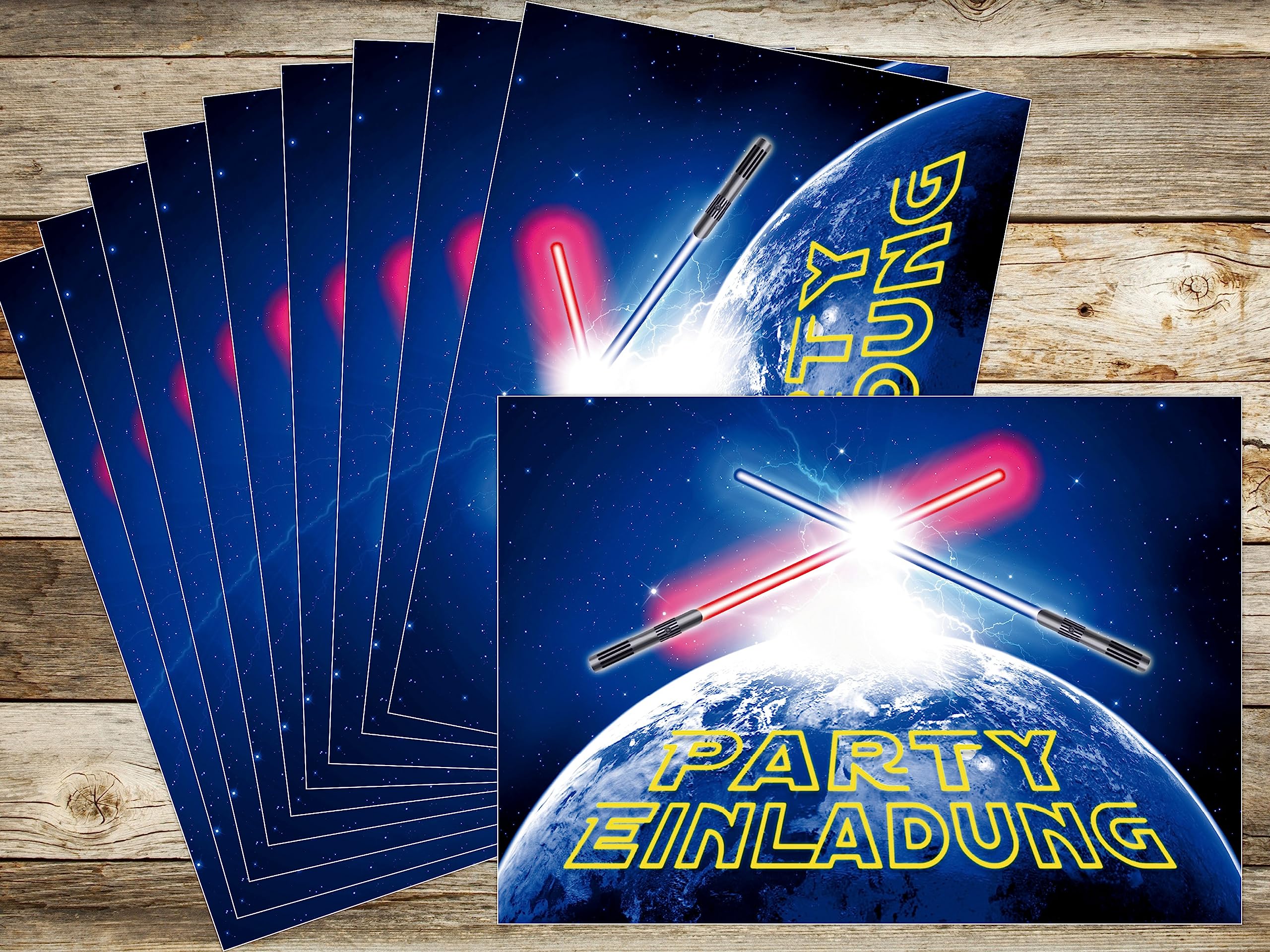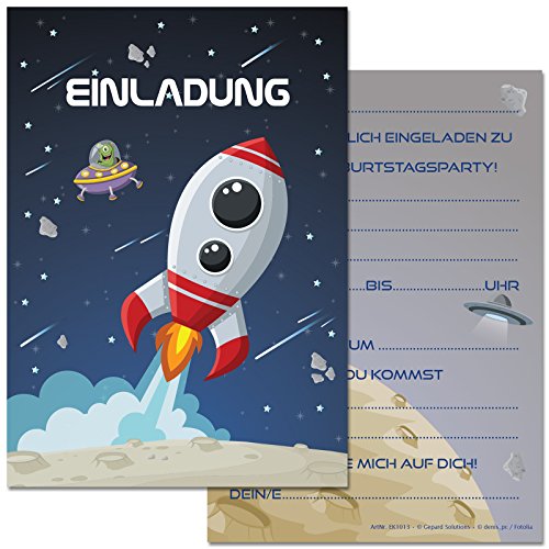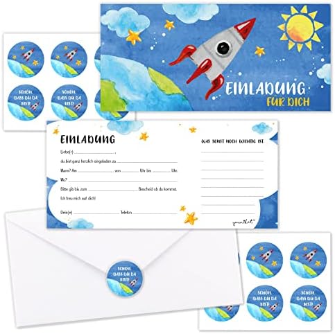 Rocket-Start für die nächste Kindergeburtstags-Party! Diese 10 Weltraum-Einladungskarten im A6-Format (14,8x10,5cm) sind der absolute Hit für kleine Astronauten. Mit coolen Sternen- und Planet-Motiven in bunten Farben - sowohl für Jungs als auch Mädchen geeignet. Hergestellt in Deutschland aus festem Kartonpapier und mit Glanzfolie veredelt, fühlen sie sich richtig hochwertig an. Die Vorderseite hat vorgedruckte Felder zum Ausfüllen - super einfach für Eltern! Die matte Rückseite kannst du mit normalen Stiften beschriften. Besonders toll: Die Karten werden klimafreundlich gedruckt und in einer Werkstatt für Menschen mit Behinderung verpackt. Mit deinem Kauf unterstützt du also ein inklusives Projekt! Perfekt für Weltraum-Partys, aber auch für Einschulungen oder Sommerfeste. Bereits über 1 Million Kunden sind begeistert - werde auch du Teil der Community! Einfach ausfüllen, verteilen und die Vorfreude auf die Party steigern!