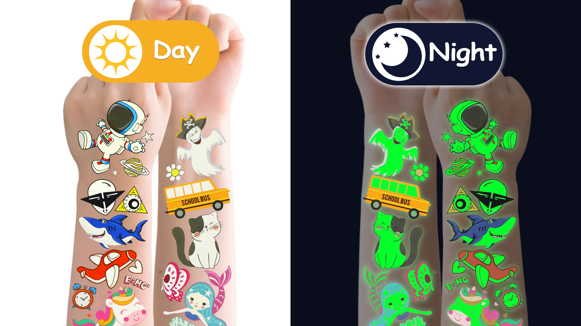 Die Tattoos haften super auf der Haut, sind aber jederzeit wieder leicht zu entfernen. Wichtig: Sie entsprechen der EU-Kosmetikrichtlinie und sind ungiftig sowie reizfrei. Allerdings nicht für Kinder unter 3 Jahren geeignet - bitte immer unter Aufsicht von Erwachsenen verwenden!