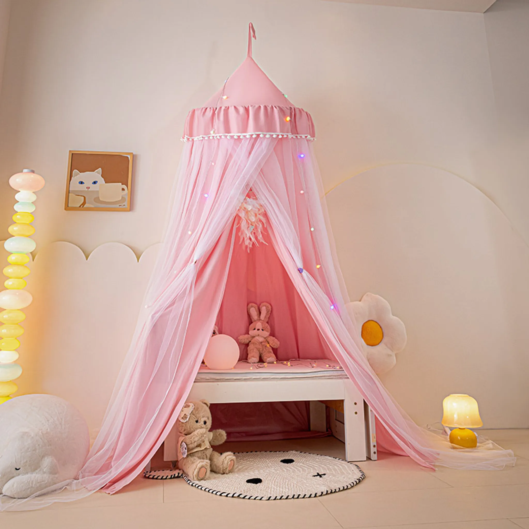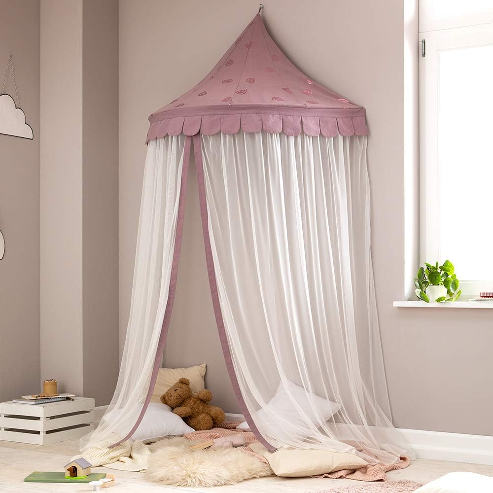 Träum süß, kleine Prinzessin! Dieser wunderschöne rosa Betthimmel schützt dein Kind nicht nur nachts vor lästigen Mücken und Insekten, sondern sieht tagsüber auch noch total niedlich im Kinderzimmer aus. Das Besondere: Das breite rosafarbene Band oben am Ring - da kannst du mit Klammern, Magneten oder Klettband die Lieblingssachen deines Kindes befestigen. Immer mal wieder austauschen für Abwechslung! Das Netz ist aus 100% Polyester und misst ca. 0,63x2,60x12,50m. Mit der 1,60m langen Aufhängeschnur kannst du die Höhe ganz individuell einstellen. Im Lieferumfang ist alles dabei, was du brauchst: Netz, Transportbeutel, Schraubhaken mit Dübeln und die Aufhängeschnur. Einfach aufhängen und dein Kind kann geborgen schlummern!