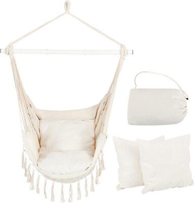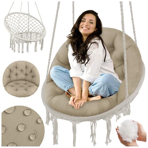 Mach deinen Hängesessel noch gemütlicher! Dieses weiße Kissen ist perfekt für Hängestühle, Schaukelsessel oder Hängekörbe. Aus hochwertigem Polyester mit wasserabweisender Oberfläche - einfach mit feuchtem Tuch abwischbar. Dick gefüllt mit weicher Baumwolle für ultimativen Sitzkomfort. Mit Gurten zum Befestigen, damit es nicht verrutscht. Super für drinnen und draußen - ob auf dem Balkon, im Garten oder Wohnzimmer. Wichtig: Nach dem Auspacken 4-5 Stunden liegen lassen, dann entfaltet es sich vollständig. Macht aus jedem Hängesessel eine richtige Wohlfühloase! Einfach draufsetzen und entspannen - so gemütlich war dein Sessel noch nie!