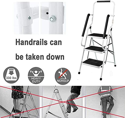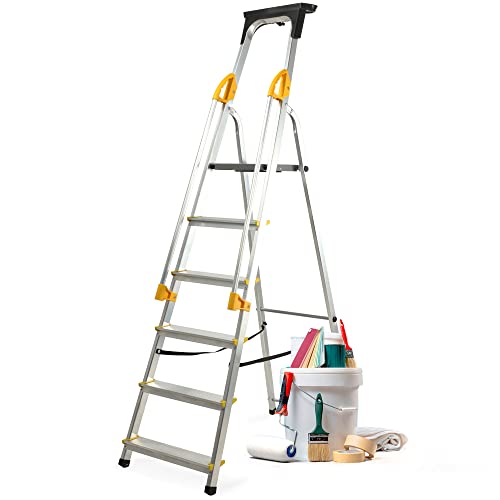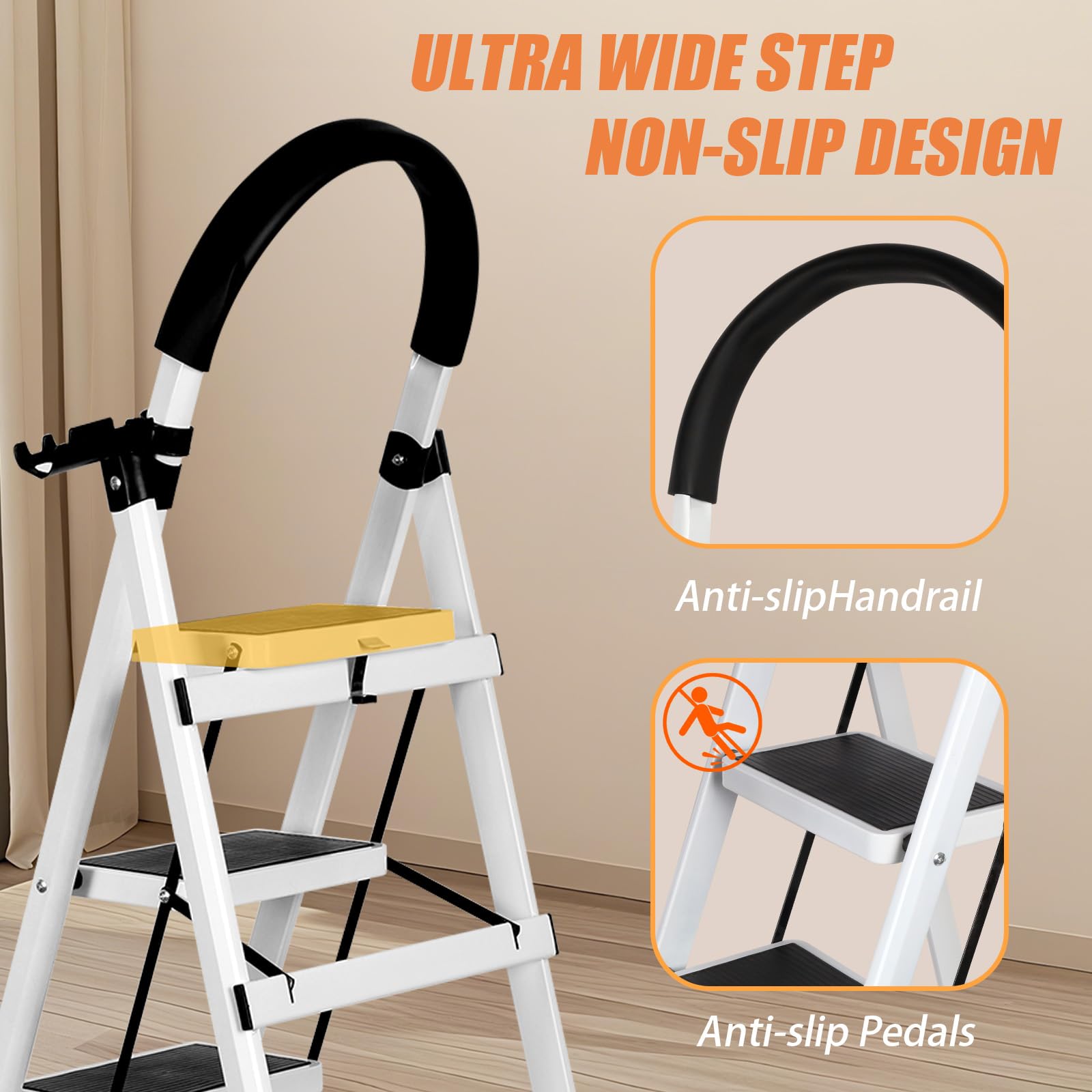Endlich eine Leiter, die nicht im Weg steht! 🪜 Diese klappbare Trittleiter mit 4 Stufen ist der perfekte Helfer für dein Zuhause.\n\nMit den Maßen 133 x 74 x 39 cm erreicht sie genau die richtige Höhe für alle Alltagsaufgaben: Glühbirnen wechseln, Oberschränke erreichen oder Vorräte verstauen.\n\nDas geniale Feature: Sie klappt auf nur 5 cm Dicke zusammen! Perfekt für die Aufbewahrung in Schränken, hinter Türen oder in kleinen Abstellräumen.\n\nDie Sicherheit wird groß geschrieben: 6 rutschfeste Füße sorgen für festen Stand, 8 seitliche Verstärkungen geben zusätzliche Stabilität. Der gebogene Handlauf liegt perfekt in der Hand.\n\nHergestellt aus robustem Kohlenstoffstahl - trägt problemlos dein Gewicht und ist langlebig. Die rutschfesten Stufen sind extra breit, damit du sicher und bequem stehen kannst.\n\nIm Lieferumfang sind sogar praktische Extras enthalten: Werkzeughalter und Schraubendreher. So hast du alles griffbereit bei Arbeiten in der Höhe.\n\nIn schickem Weiß passt die Leiter in jede Wohnumgebung. Ob in der Küche, im Bad oder im Flur - sie ist immer schnell zur Hand.\n\nHol dir diese praktische Leiter und mach dein Zuhause sicherer und zugänglicher! Einfach ausklappen, hochsteigen und erledigen was ansteht! 🛠️