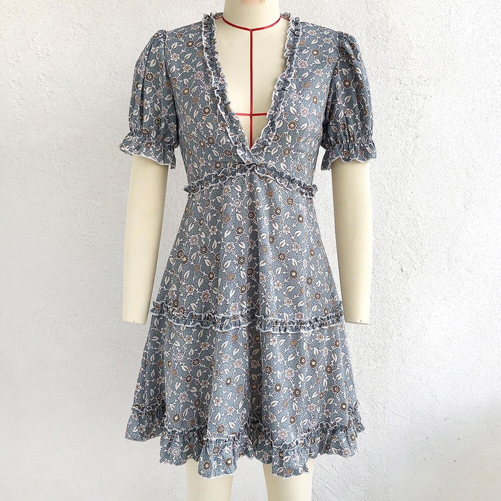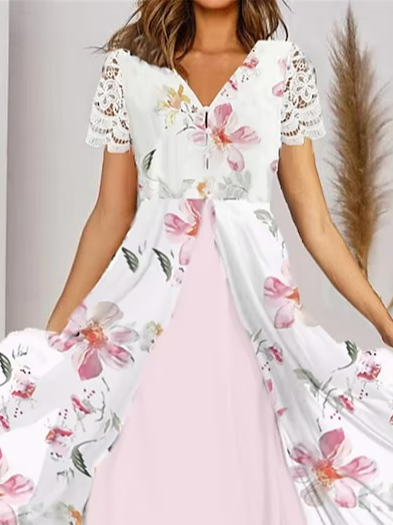 MOKBAY Damen Kleid Blumenprint Lang - V-Ausschnitt Sommerkleid Boho Style