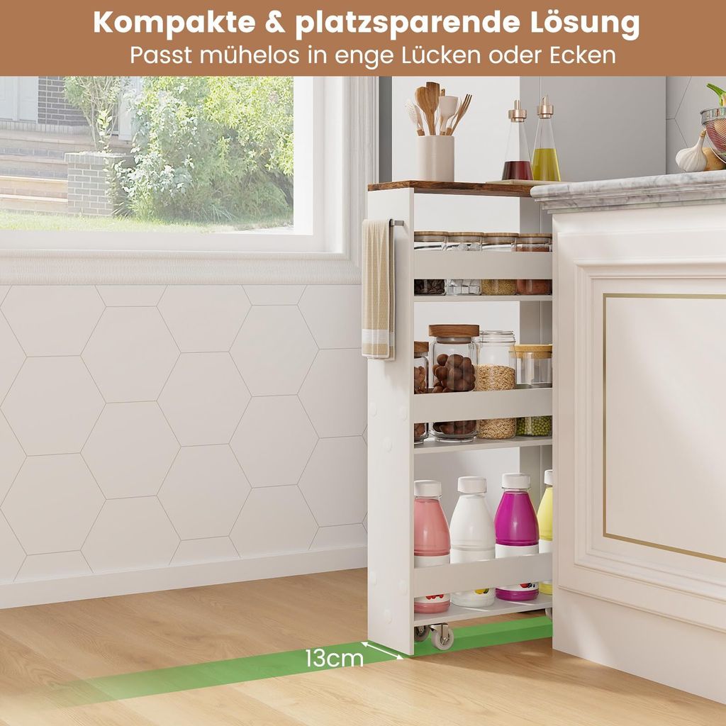 Dieser praktische Servierwagen von Klihome bringt Ordnung in deine vier Wände! Mit 4 geräumigen Ebenen (39 x 84 x 20,5 cm) bietet er jede Menge Stauraum für Küchenutensilien, Gewürze, Bücher, Pflegeprodukte oder was auch immer du verstauen möchtest. Die durchbrochenen Böden sehen nicht nur stylisch aus, sondern sorgen auch für gute Belüftung und verhindern Staubansammlungen. Die hochgezogenen Ränder geben deinen Sachen sicheren Halt, selbst wenn du den Wagen bewegst. Aus robusten Metallrohren und hochwertigem Kunststoff gefertigt, trägt er bis zu 20 kg und ist richtig stabil. Die 4 schwenkbaren Rollen (2 mit Feststellern) machen ihn super mobil - schieb ihn einfach dorthin, wo du ihn gerade brauchst. Ob in der Küche als Gewürzwagen, im Wohnzimmer für Snacks, im Bad für Kosmetik oder im Homeoffice für Büromaterial - dieser Allrounder ist überall einsetzbar. Einfach montieren und sofort nutzen!