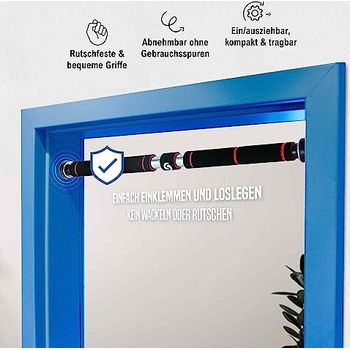 Endlich ein richtiges Home-Gym! Diese Klimmzugstange von Fjoerdesports ist der Hit für dein Training zu Hause. Ohne Bohren - einfach zwischen den Türrahmen spannen (passt bei 65-90cm Breite) und los geht's! Hält bis zu 120kg aus, also für die meisten mehr als genug. Die runden Gummiaufsätze schonen deine Tür und verteilen den Druck super. Mit zwei Sicherheitsspannhebeln, die ein Verdrehen verhindern. Die Griffflächen sind dick gepolstert und rutschfest - selbst bei schwitzigen Händen hast du perfekten Halt. Ob Klimmzüge, Liegestütze oder Bauchtraining - die Möglichkeiten sind vielfältig. In verschiedenen Farben erhältlich (rot, schwarz, blau). Montage in wenigen Minuten - einfach die Teleskopstange auf die richtige Länge ziehen, festspannen und trainieren! Perfekt für Anfänger und Fortgeschrittene. Mach deine Tür zum Fitnessstudio!