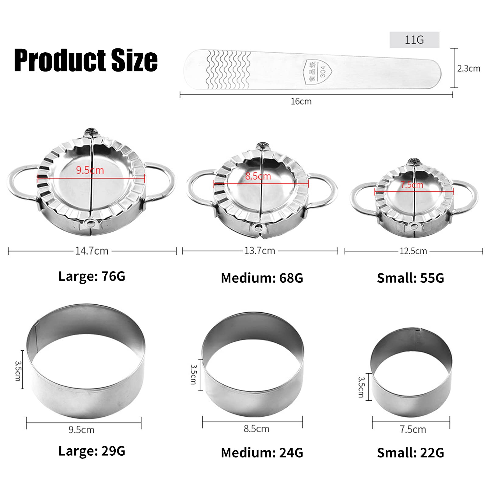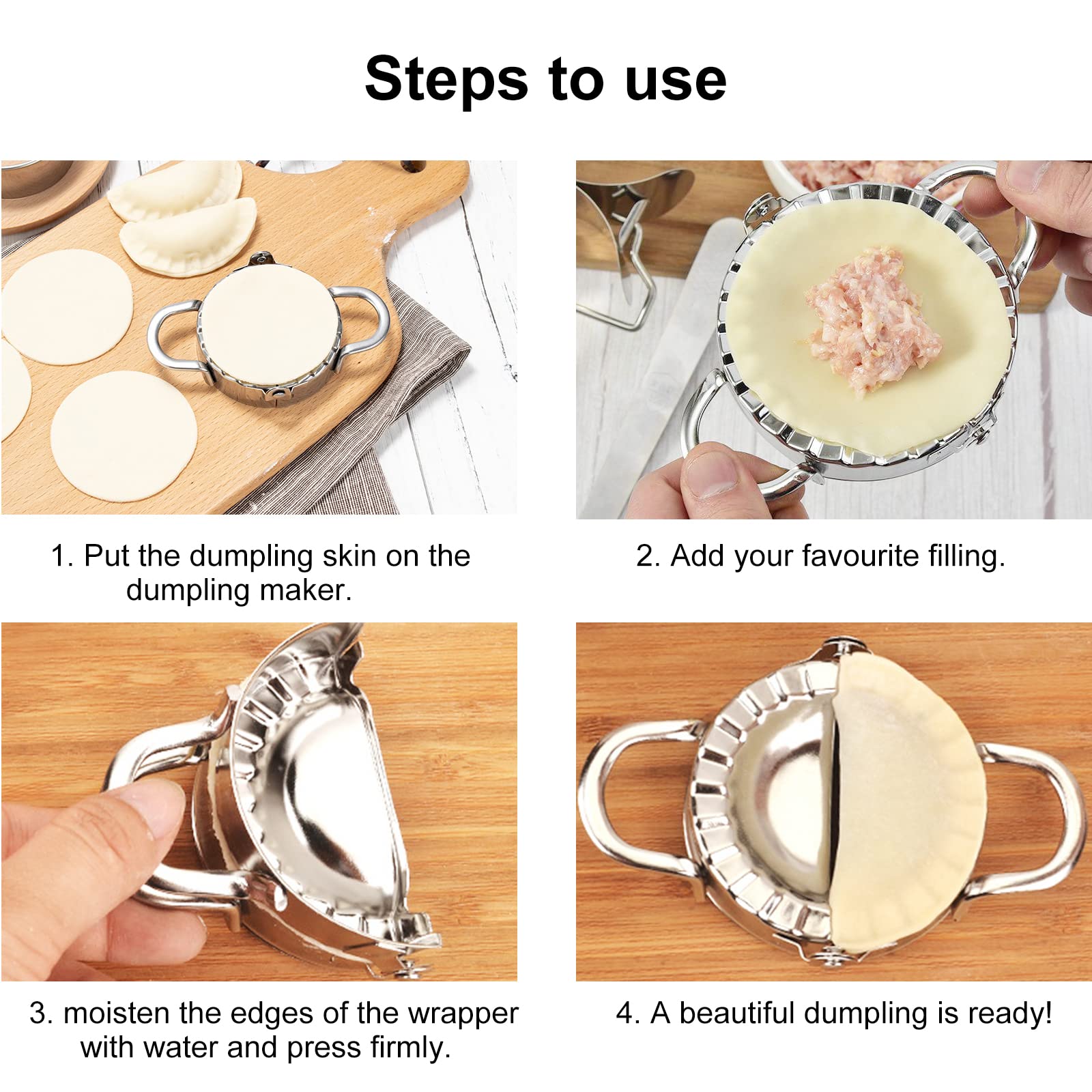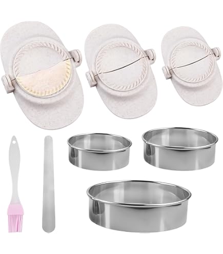 Macht das Teigtaschen-Machen auch so viel Arbeit? Dieses Set macht's kinderleicht! 2 Formater in verschiedenen Größen: 7,5 cm und 9,5 cm. Aus Edelstahl 304 - rostfrei und super langlebig. Einfach Teigblatt drauf, Füllung rein, zuklappen - fertig! Perfekte Form jedes Mal - und nichts läuft aus. Für Wontons, Knödel, Ravioli - oder sogar kleine Pfannkuchen. Mit praktischem Löffel für die Füllung. Ergonomische Griffe - liegen super in der Hand. Spülmaschinenfest - easy zu reinigen. Super für Anfänger und Profi-Köche. Macht Kochen zum Vergnügen - und die Teigtaschen sehen aus wie vom Profi! Einfach ausprobieren - du wirst nie wieder ohne arbeiten wollen! Perfekt für asiatische Küche oder italienische Pasta.