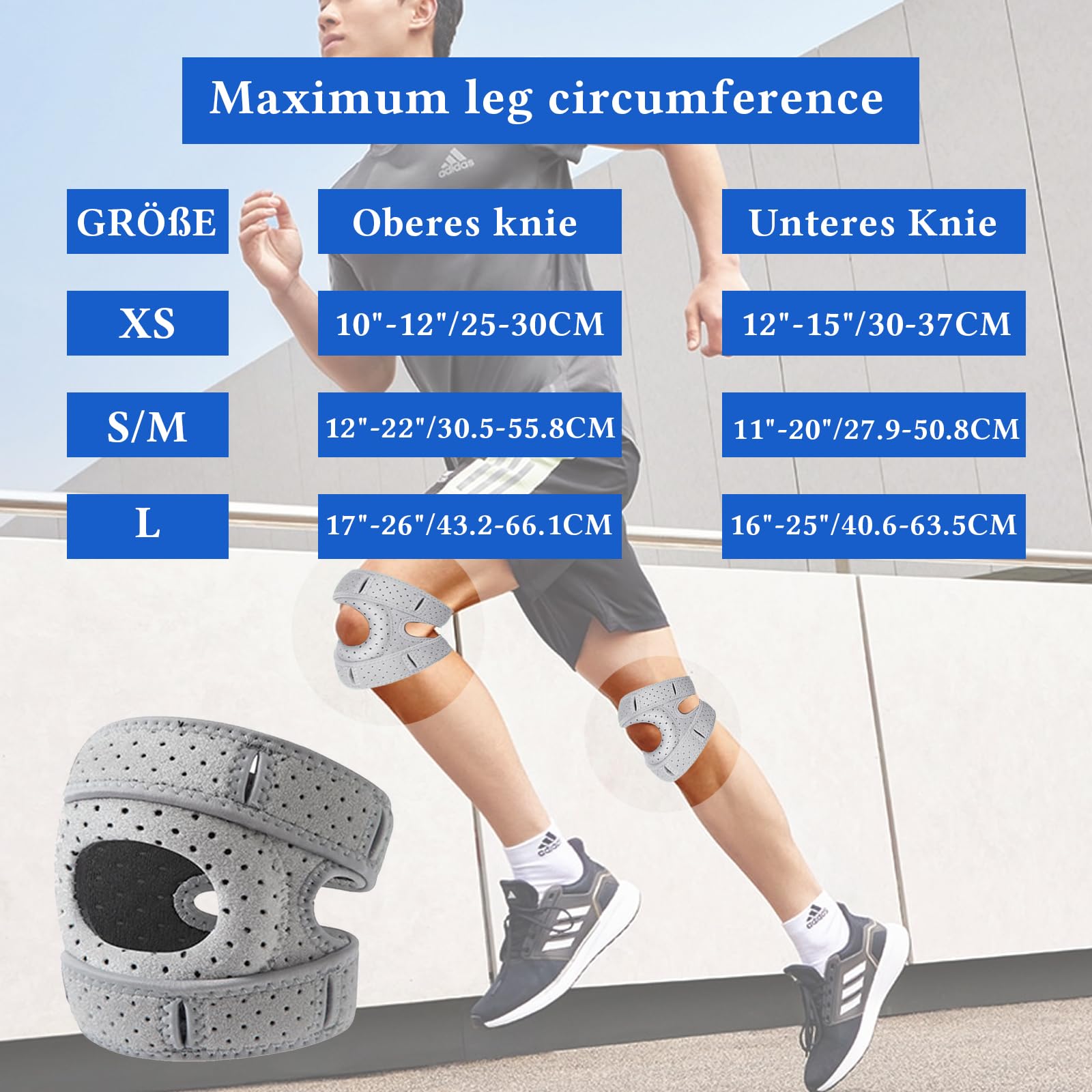 Aktive Menschen, diese Kniebandage gibt euch die Unterstützung, die ihr braucht! Voll verstellbar für perfekten Sitz - passt sich jedem Knie an. Aus atmungsaktivem Neopren-Material - bequem auch bei längerem Tragen. Die Antikollisions-Polsterung schützt das Kniegelenk vor Stößen. Perfekt für Sportarten wie Laufen, Bergsteigen oder auch für die Arbeit! Hilft bei Meniskus-Problemen und beugt Verletzungen vor. Einfach anzulegen - die Schnallen stören nicht bei der Bewegung. Ob nach einer Verletzung oder zur Vorbeugung - diese Bandage gibt dir Sicherheit! Einfach umschnallen und aktiv bleiben!