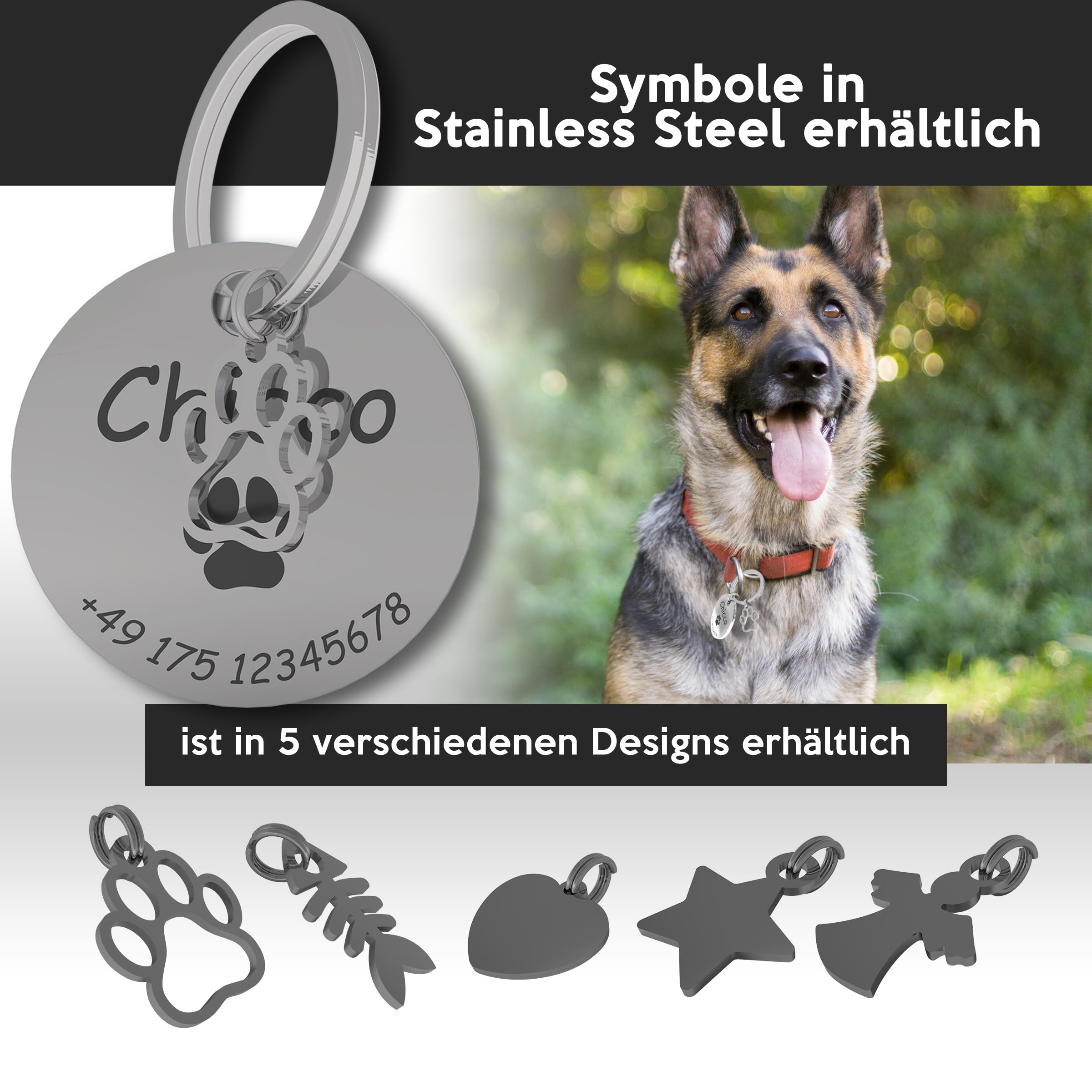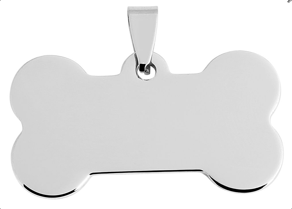 Die perfekte Hundemarke für deinen Liebling! In Knochenform (50x30mm) aus hochwertigem Edelstahl, die wir persönlich für dich gravieren. Du kannst Vorder- und Rückseite mit Namen, Telefonnummer und Adresse versehen - und dazu noch ein süßes Symbol wie Pfote, Herz, Stern oder Blume wählen. Die Lasergravur ist super tief und verblasst nie - auch nicht bei Regen, Schnee oder wildem Herumtoben. Mit nur 20g Gewicht ist sie angenehm leicht für deinen Hund. Inklusive Edelstahlring für einfaches Befestigen am Halsband. Made in Italy - Qualität, die überzeugt. Das ideale Geschenk für alle Hundefreunde!