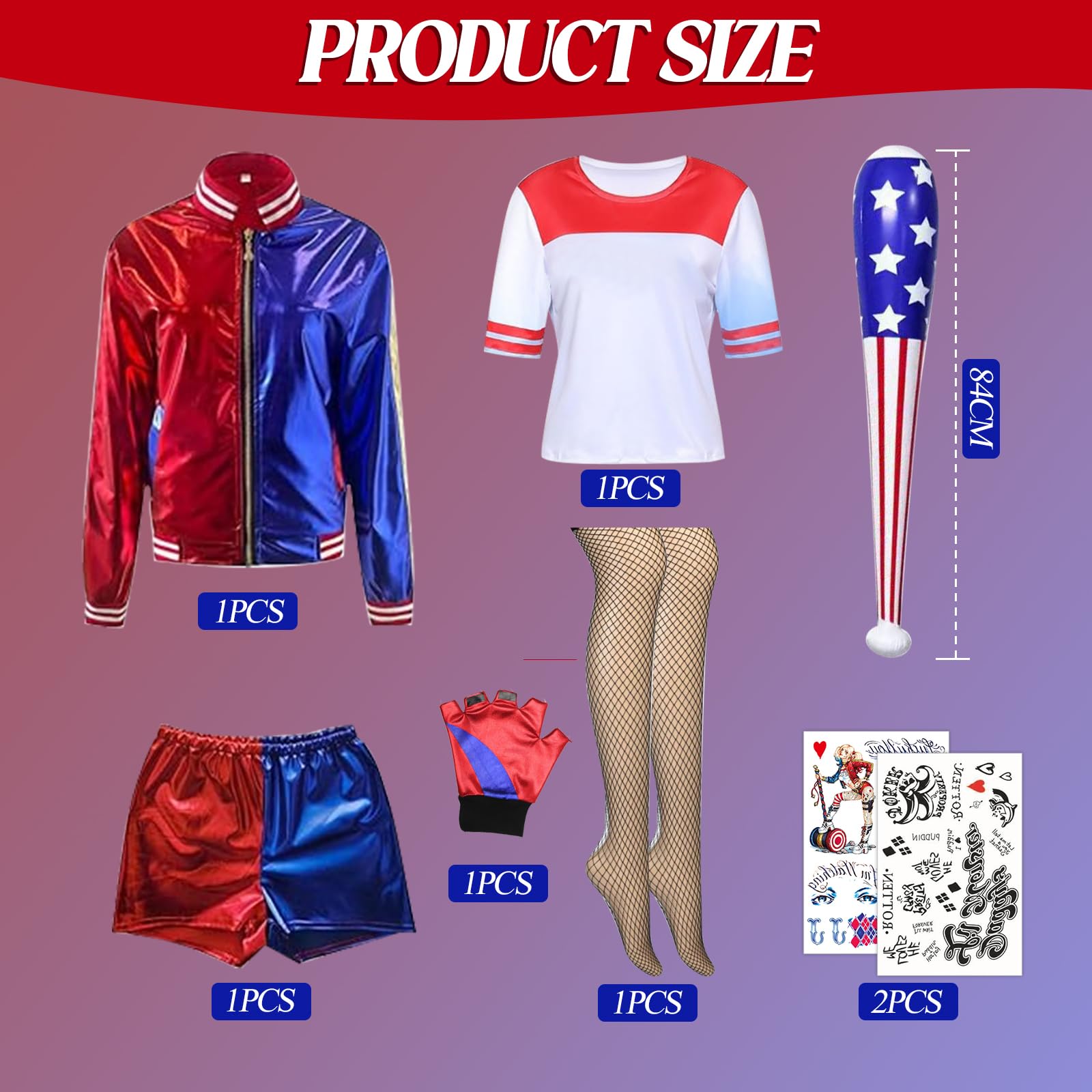 Alter, dieses Quinn Kostüm von BITOYO ist der absolute Hammer für alle Cosplay-Fans! Komplett 7-teiliges Set mit Jacke, T-Shirt, Shorts, Handschuhen, Netzstrümpfen, Halskette und Baseballschläger - alles was du brauchst! Das Design ist genau wie im Film: rot-blaues Farbschema, wilde Prints und total authentisch. Aus stretchigem Material, sitzt bequem und reizt die Haut nicht. Perfekt für Halloween-Partys, Karneval, Cosplay-Events oder Mottogeburtstage. Einfach anziehen und sofort in die Rolle der verrückten Quinn schlüpfen! Musst nichts extra kombinieren - alles dabei. Damit ziehst du definitiv alle Blicke auf dich! Ob für dich selbst oder als Geschenk - jedes Quinn-Fanherz schlägt höher. Mach die Party unsicher mit diesem wilden Outfit!