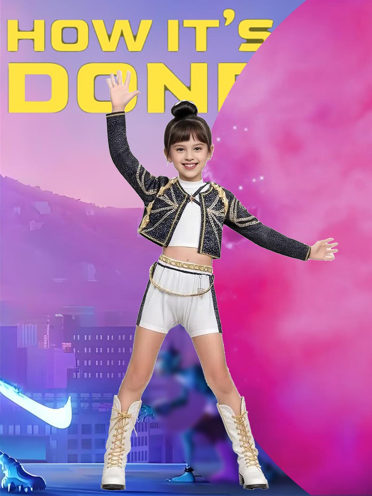 Für alle K-Pop Fans: Dieses Rumi Kostüm lässt Mädchen-Träume wahr werden! Das Set besteht aus bauchfreiem Top und kurzer Hose - oder wahlweise mit schwarzer Jacke, weißem Hemd und Shorts. Aus weichem Polyester-Spandex-Mix, super bequem und beweglich. Die Verarbeitung ist echt aufwendig, jedes Detail sitzt! Perfekt für Cosplay-Events, Halloween, Bühnenauftritte oder einfach zum Spielen. Von 110 bis 160 cm Größen erhältlich - aber Achtung: Asiatische Größen fallen kleiner aus, also unbedingt die Größentabelle checken vor dem Kauf! Dein Kind wird sich fühlen wie ein echter K-Pop Star und alle Blicke auf sich ziehen. Ob für die nächste Party oder einfach nur zum Verkleiden zu Hause - mit diesem Outfit ist deine Kleine der absolute Star!