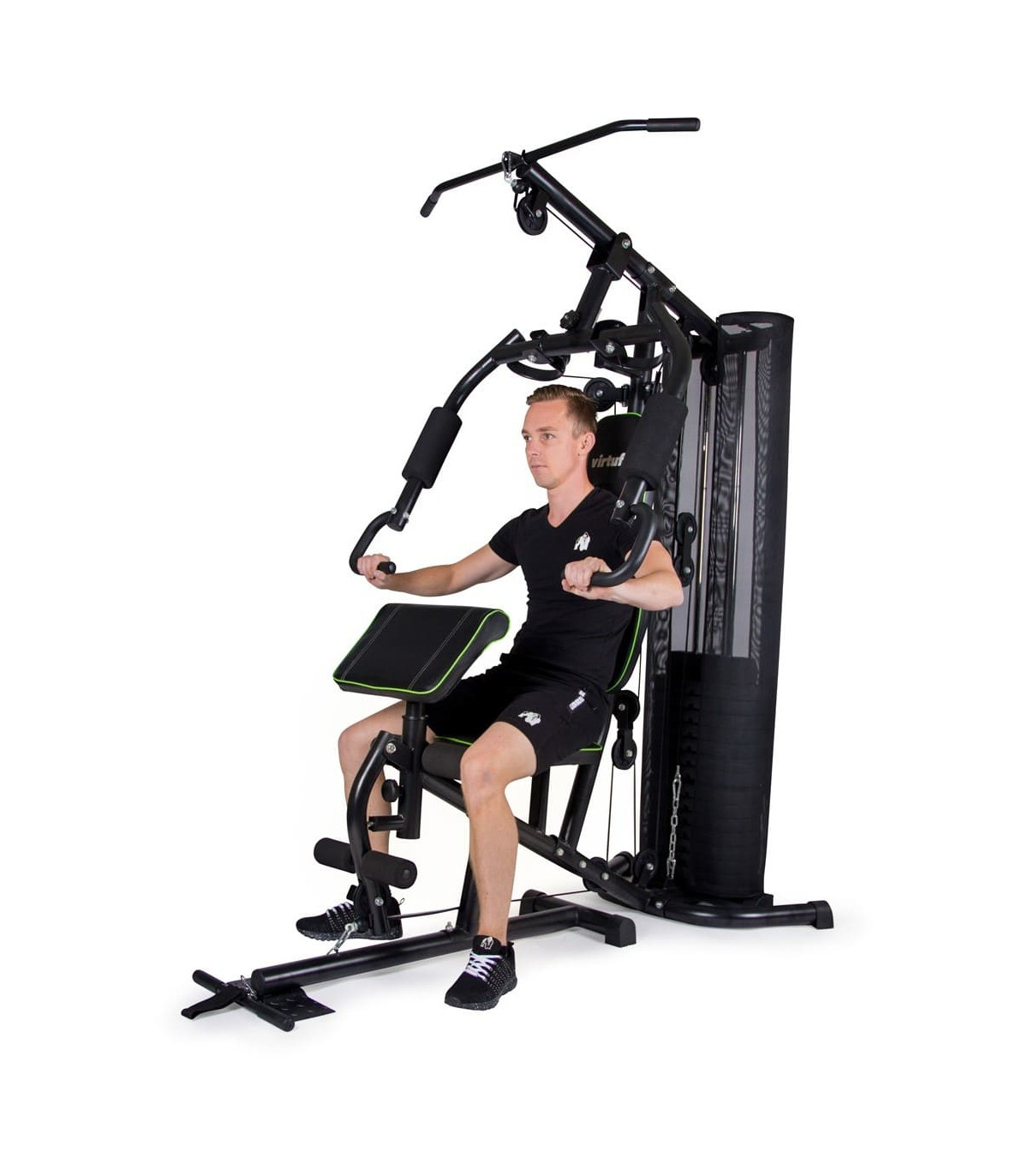 Endlich ein komplettes Fitnessstudio für zu Hause! Die VirtuFit KH100 Kraftstation bietet dir über 50 verschiedene Übungen auf nur 2qm Fläche. \\n\\nMit robustem 5x5cm Stahlrahmen und 67,5kg Gesamtgewicht - stabil wie ein Profi-Gerät! Die 15 Gewichtsblöcke à 4,5kg lassen sich individuell einstellen. \\n\\nTrainingsmöglichkeiten: \\n• Latzug und Rudern \\n• Brustpresse und Butterfly \\n• Bizeps-Curls mit Preacher Pad \\n• Beinpresse und -extension \\n• Cable-Übungen für Bauch und Rücken \\n\\nKomfort-Features: \\n• Schaumstoff-Polsterungen \\n• Verstellbarer Sitz \\n• Airflow-Rückenlehne \\n• Weiche Griffe \\n\\nPlatzsparendes Design - perfekt für Wohnzimmer, Garage oder Keller. Mit 2 Jahren Garantie und deutscher Anleitung. \\n\\nHol dir diese All-in-One Lösung und erreiche deine Fitness-Ziele bequem von zu Hause aus!