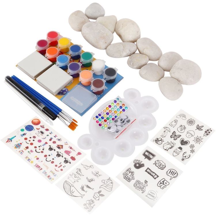 Suchst du ein kreatives Beschäftigung für deine Kinder? Dieses Steine-bemalen-Set bringt Stunden voller Spaß! Enthalten sind 10 glatte Steine, 6 Standardfarben, 6 Metallicfarben, 5 Nachtleuchtfarben, Glitzerkleber, Edelsteine und 4 Pinsel - alles was kleine Künstler brauchen.
