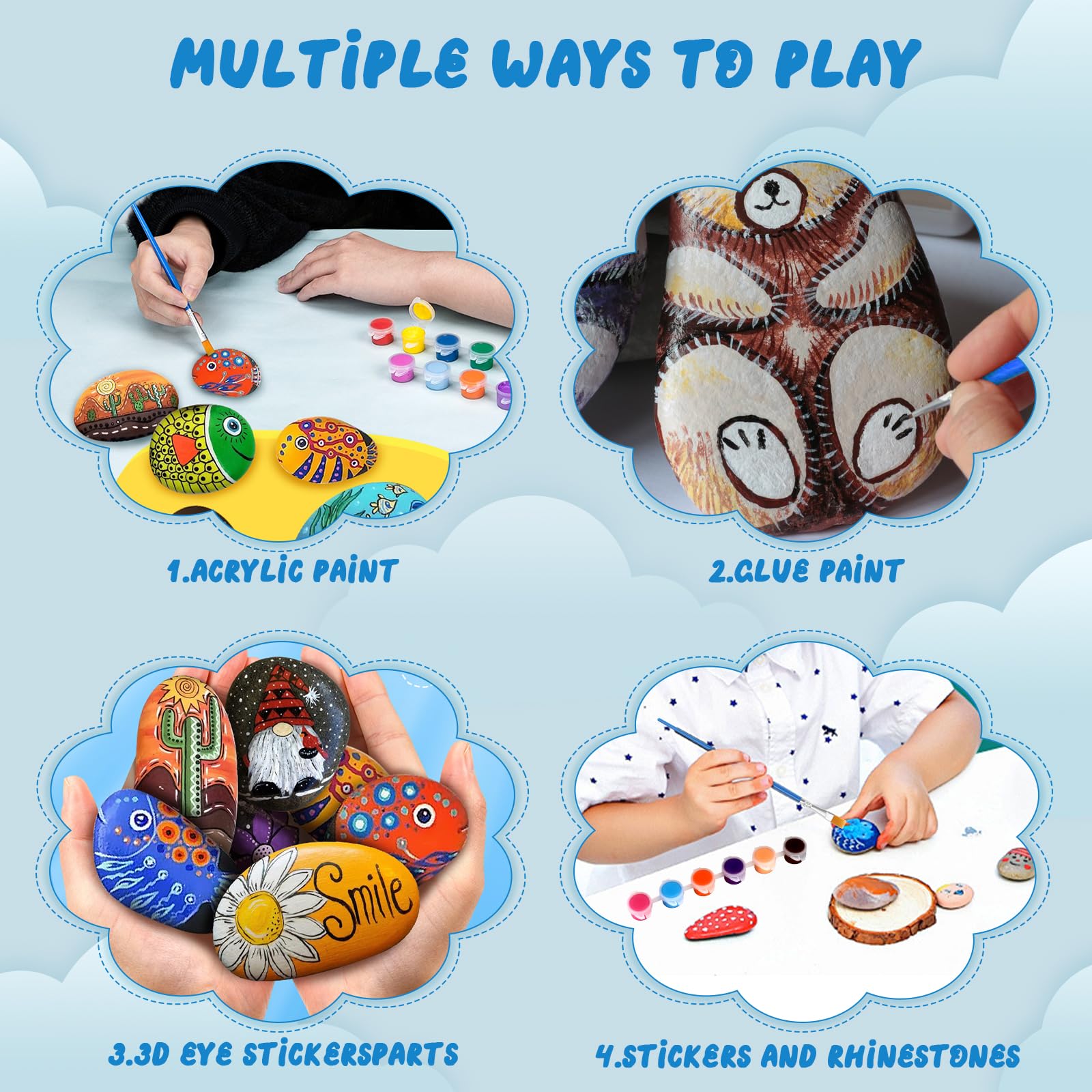 Die ungiftigen, geruchsneutralen Farben sind abwaschbar und sicher für Kinder ab 6 Jahren. Perfekt für Eltern-Kind-Aktivitäten, Geburtstagsfeiern oder als Geschenk. Die bemalten Steine können als Gartendekoration, Tischschmuck oder bei der 'Stone Passing' Aktion verwendet werden. Förder die Kreativität deiner Kinder!