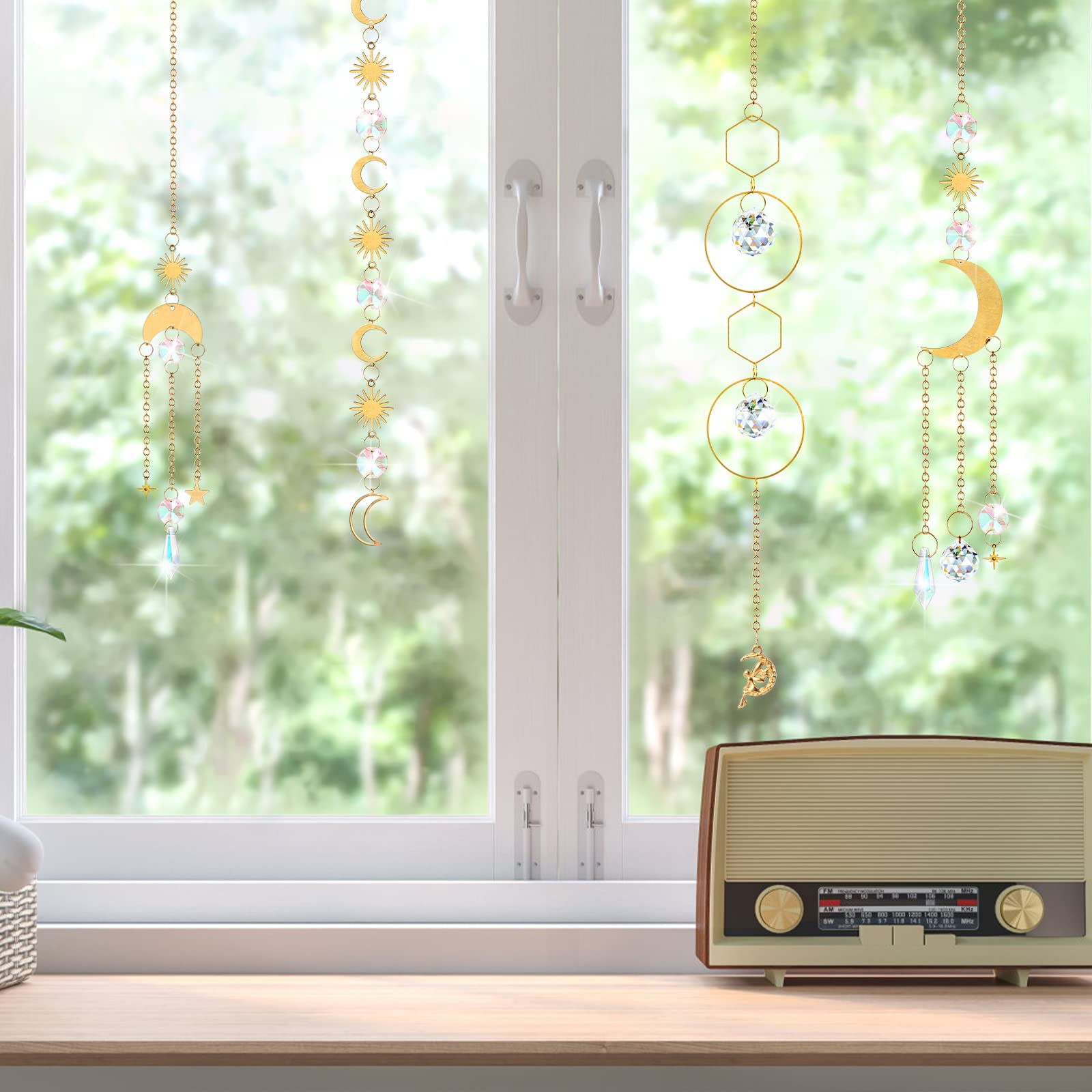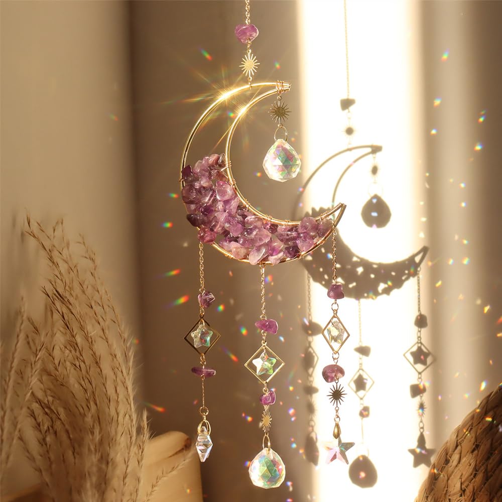 Sobald die Sonne drauf scheint, zaubern die Kristallprismen wunderschöne Regenbogen-Lichtpunkte an die Wände - einfach traumhaft! Mit Sonne, Mond und Sternen als Symbol für ewige Liebe und Schutz.