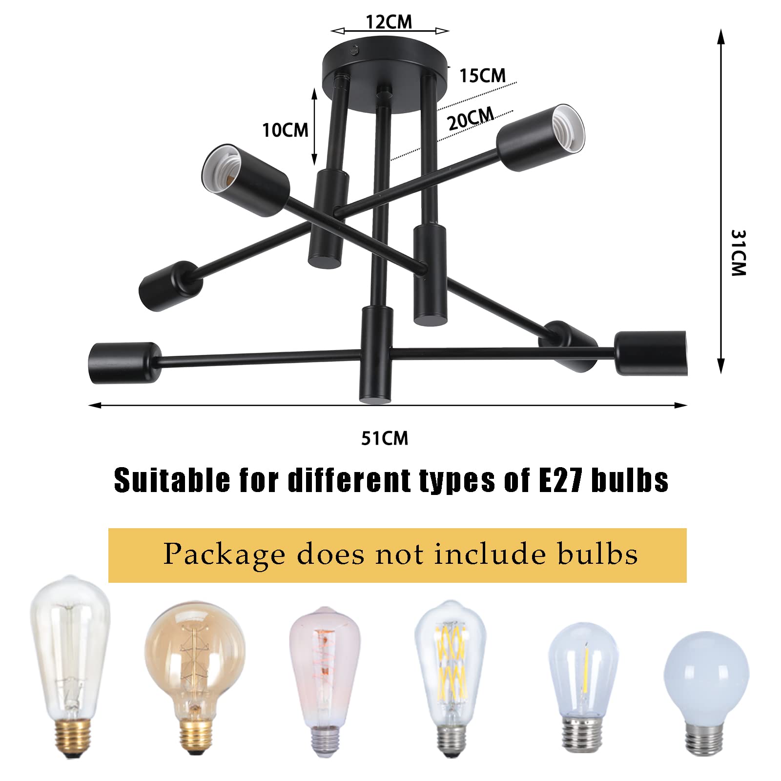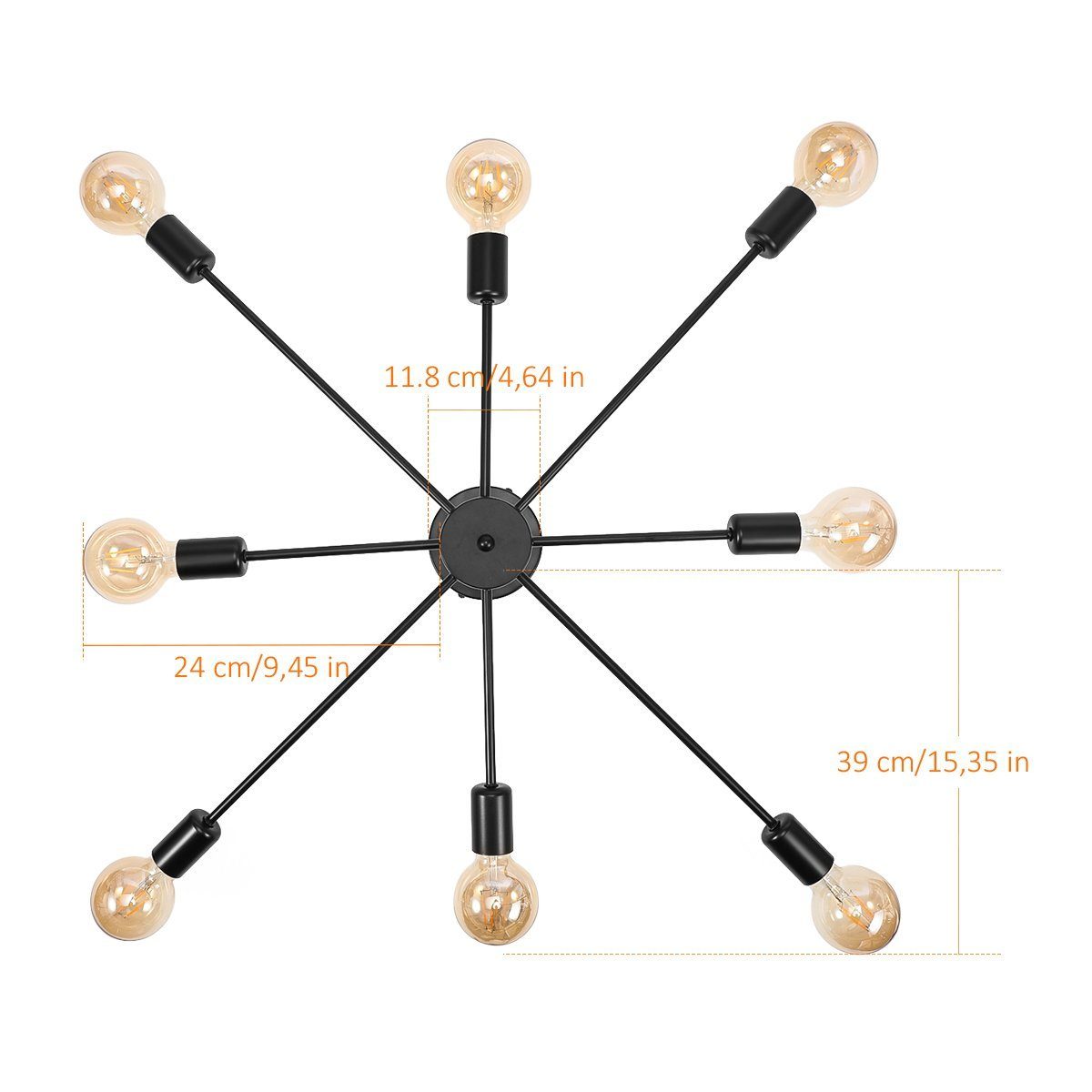 Bring Retro-Charme in dein Zuhause! Dieser wunderschöne 6-armige Kronleuchter im Sputnik-Design verleiht jedem Raum besonderen Flair. In eleganter Schwarz-Gold-Optik - ein echter Hingucker! Mit E27-Fassungen für alle Standard-Glühbirnen (nicht im Lieferumfang). Die verstellbaren Arme ermöglichen individuelle Lichtrichtung. Halbeinbaubar für moderne Decken - einfache Installation mit beiliegender Anleitung. Aus hochwertigem Metall mit Rostschutz - hält jahrelang. Perfekt für Wohnzimmer, Schlafzimmer, Küche oder Flur. Schafft gemütliche Atmosphäre und gutes Licht. 3 Jahre Garantie geben dir Sicherheit. Verwandele deine vier Wände in eine stylische Wohlfühloase - dieser Leuchter wird zum absoluten Lieblingsstück!