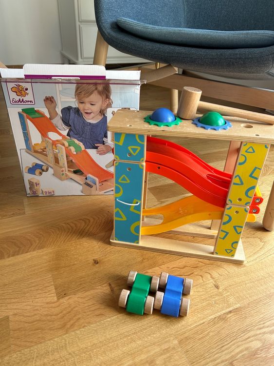 Wow, was für ein cooles Spielzeug! Diese 2-in-1 Kugelbahn aus Holz ist sowohl Murmelbahn als auch Autorennbahn in einem. Mit 4 kleinen Autos und 2 Bällen können die Kids stundenlang spielen. Die Bahn ist 27x24cm groß und hat 4 verschiedene Ebenen - da ist Action garantiert! Die Autos haben extra stabile Achsen, damit keine Räder abfallen und die Kleinen nichts verschlucken können. Unten gibt's sogar einen praktischen Parkplatz wo die Autos sicher landen. Super einfach zusammenzubauen - einfach die Teile zusammenstecken, schon kann's losgehen! Fördert die Hand-Augen-Koordination und das räumliche Denken. Aus hochwertigem Holz gefertigt und komplett mit abgerundeten Ecken. Perfekt für Kinder von 1-6 Jahren. Einfach aufbauen und zuschauen wie die Kleinen voll auf ihre Kosten kommen!