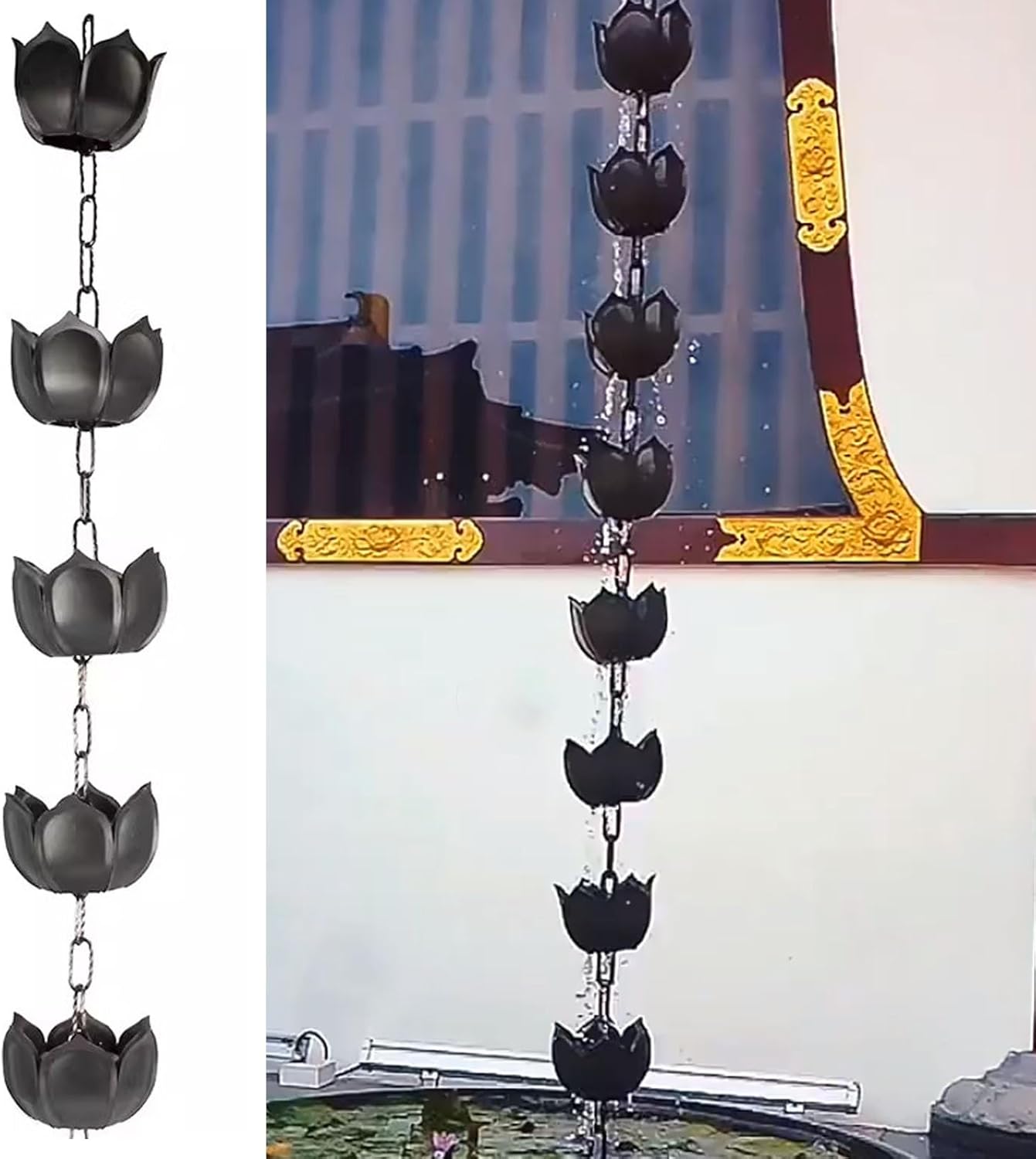 Regen wird zum Erlebnis mit dieser wunderschönen Regenkette! Die 1,22 Meter lange Kette im edlen Kupfer-Look mit fünf Lotus-Blütenbechern ist nicht nur praktisch, sondern ein echter Hingucker für dein Zuhause. Statt langweiliger Fallrohre zauberst du damit eine richtig stimmungsvolle Atmosphäre in deinem Garten, auf der Terrasse oder im Innenhof. Aus robustem, verzinktem Metall gefertigt, hält sie jedem Wetter stand und rostet nicht. Die Installation ist super einfach - kein Werkzeug nötig! Einfach den Adapter an der Dachrinne befestigen und die Kette einhängen. Schon kann das Regenwasser sanft durch die Lotus-Blüten rinnen und dabei ein beruhigendes Plätschern erzeugen. Inspiriert von der japanischen Architektur ist diese Regenkette nicht nur ein praktisches Entwässerungssystem, sondern auch ein kleines Kunstwerk für dein Zuhause. Perfekt für einstöckige Häuser und eine tolle Alternative zu herkömmlichen Regenfallrohren. Verwandele Regenwasser in ein faszinierendes Schauspiel!