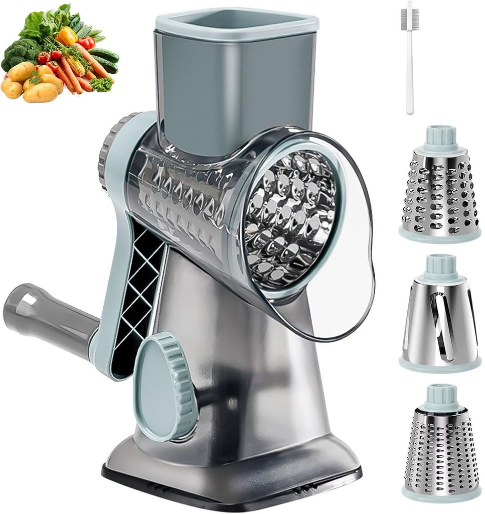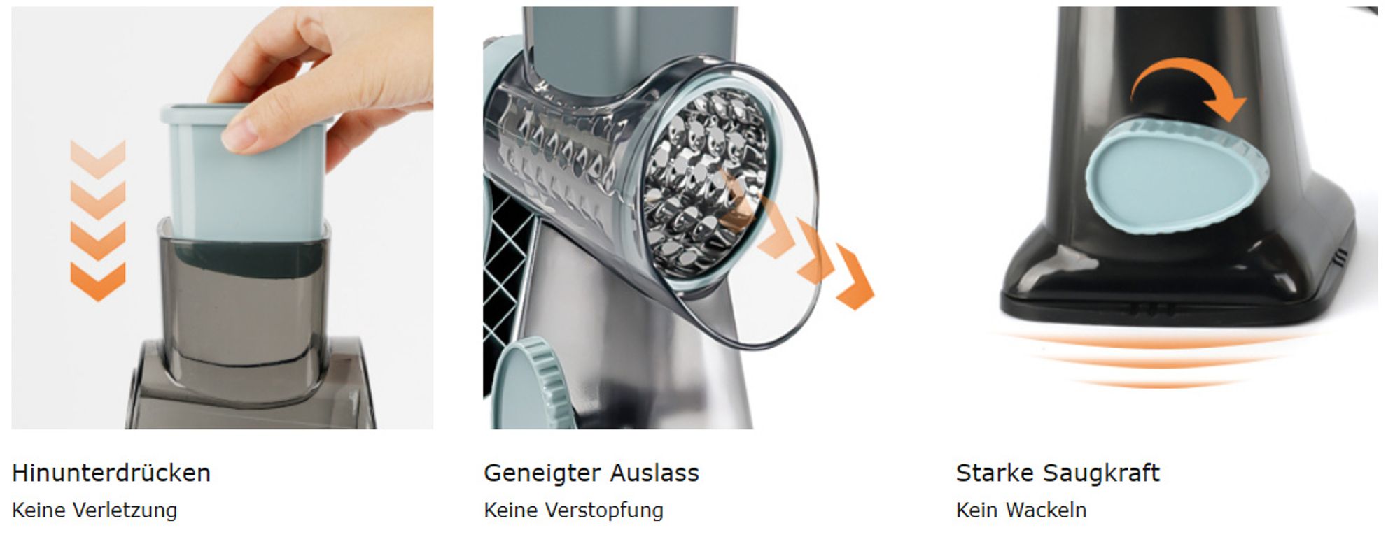 Küchen-Zeit sparen war noch nie so einfach! Diese Käsereibe mit Kurbel hat 3 austauschbare Edelstahl-Klingen für feines und grobes Reiben sowie Schneiden. Einmal drehen = 12 Schnitte! Aus BPA-freiem Kunststoff und Edelstahl - spülmaschinengeeignet. Mit starkem Saugfuß für stabilen Halt auf der Arbeitsplatte. Perfekt für Käse, Karotten, Gurken, Nüsse und mehr. Sicherheits-Design - keine Berührung mit scharfen Klingen! Einfach zu reinigen unter fließendem Wasser. Spart Platz im Schrank - alle Teile stapelbar. Super Geschenk für Hobbyköche! Mach deine Küchenarbeit schneller und sicherer - dreh einfach die Kurbel!
